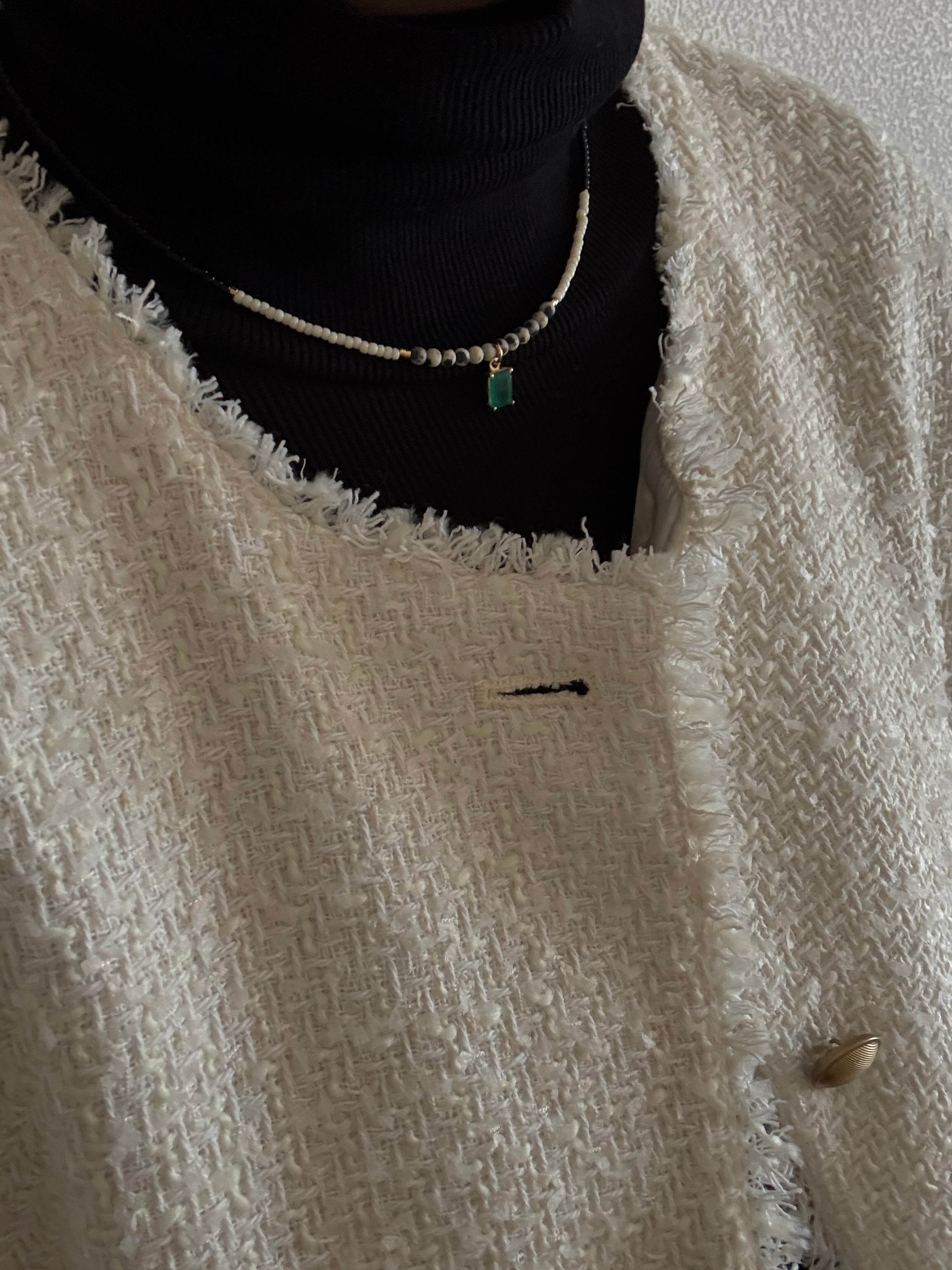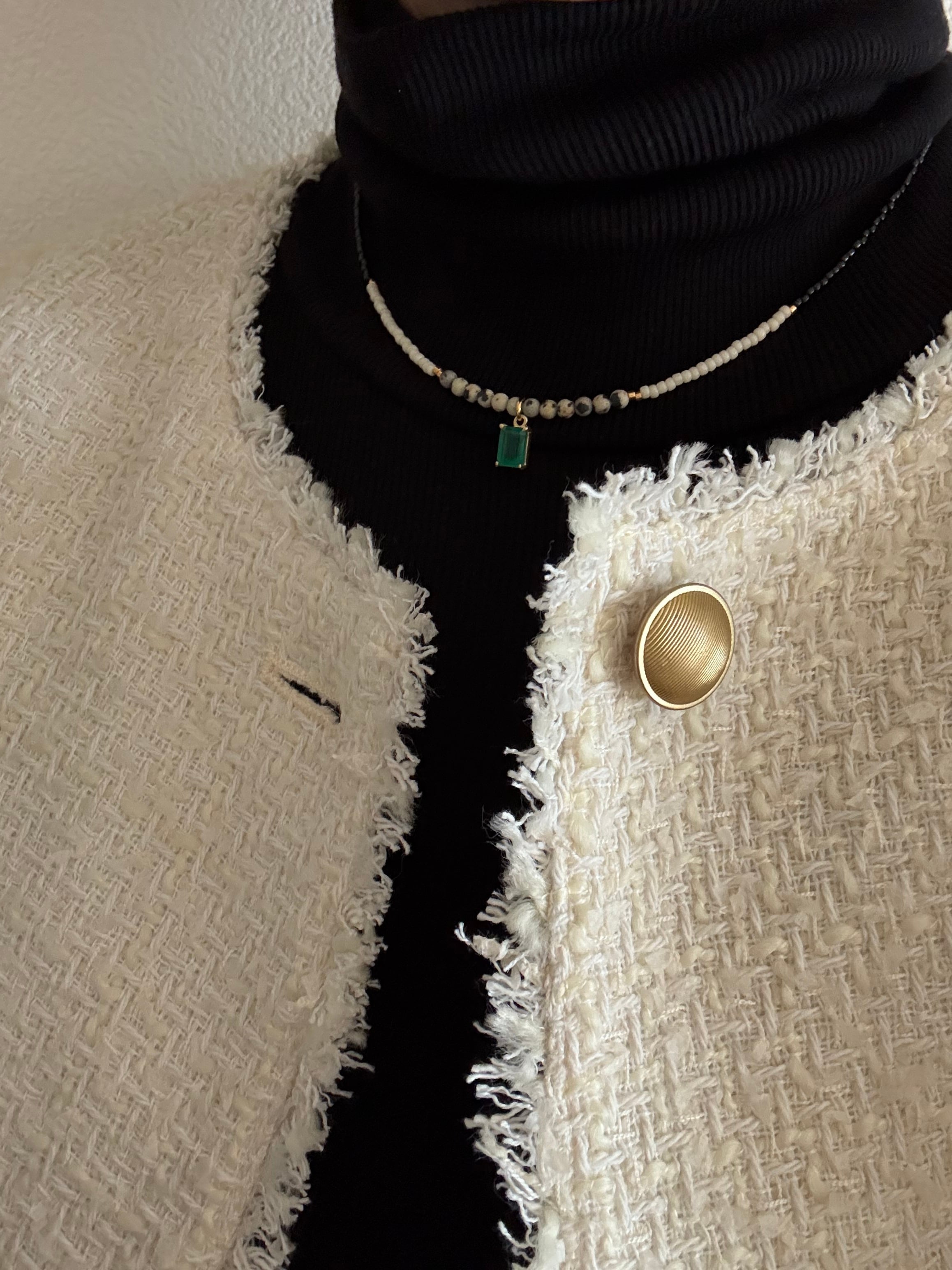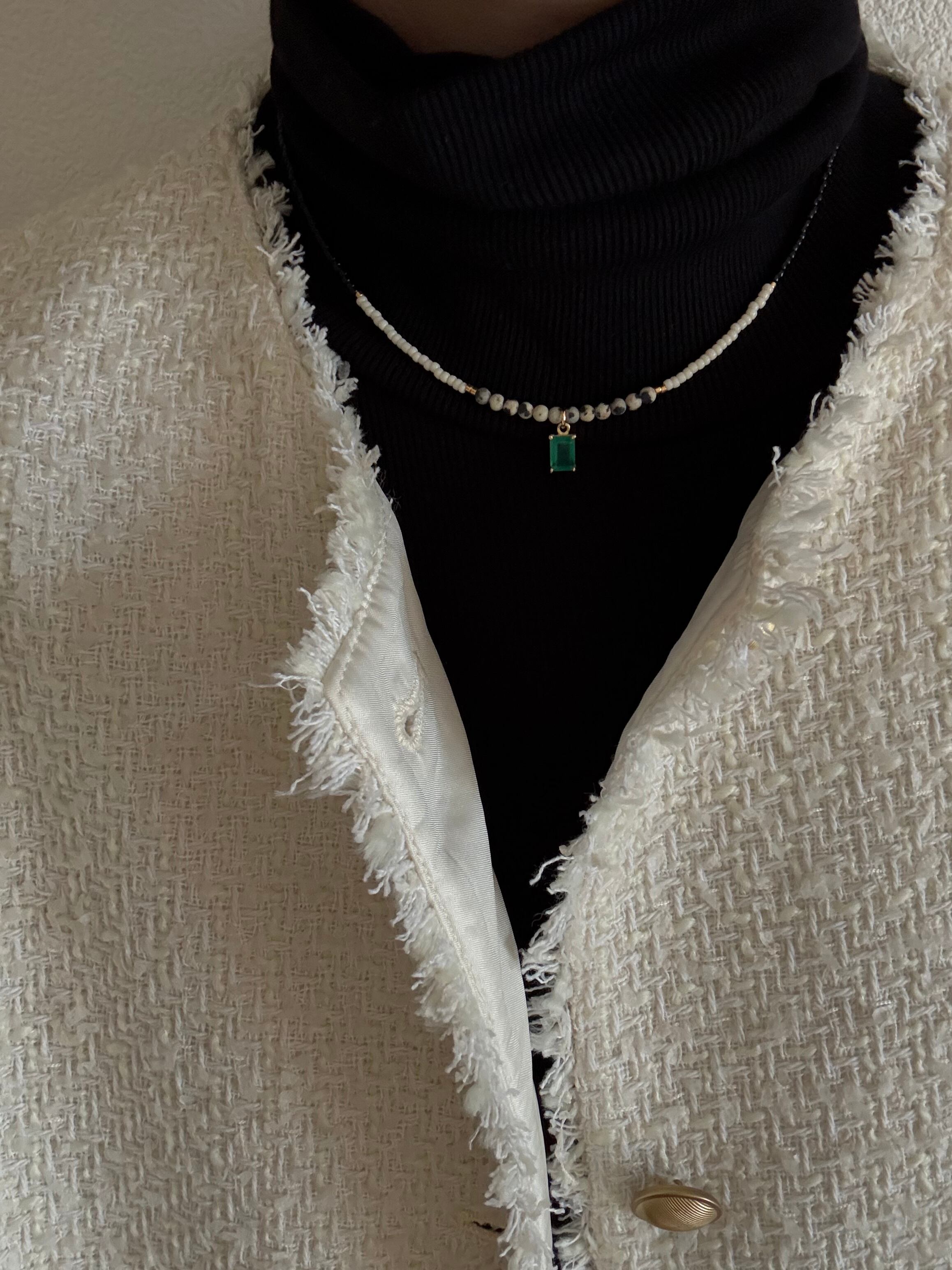 グリーンオニキスとダルメシアンジャスパーの組み合わせが素敵だったのでこの2つで配置しようと思いましたが、そこにビーズを合わせることでファッション性が上がり,よりお洋服に合わせやすくなりました。