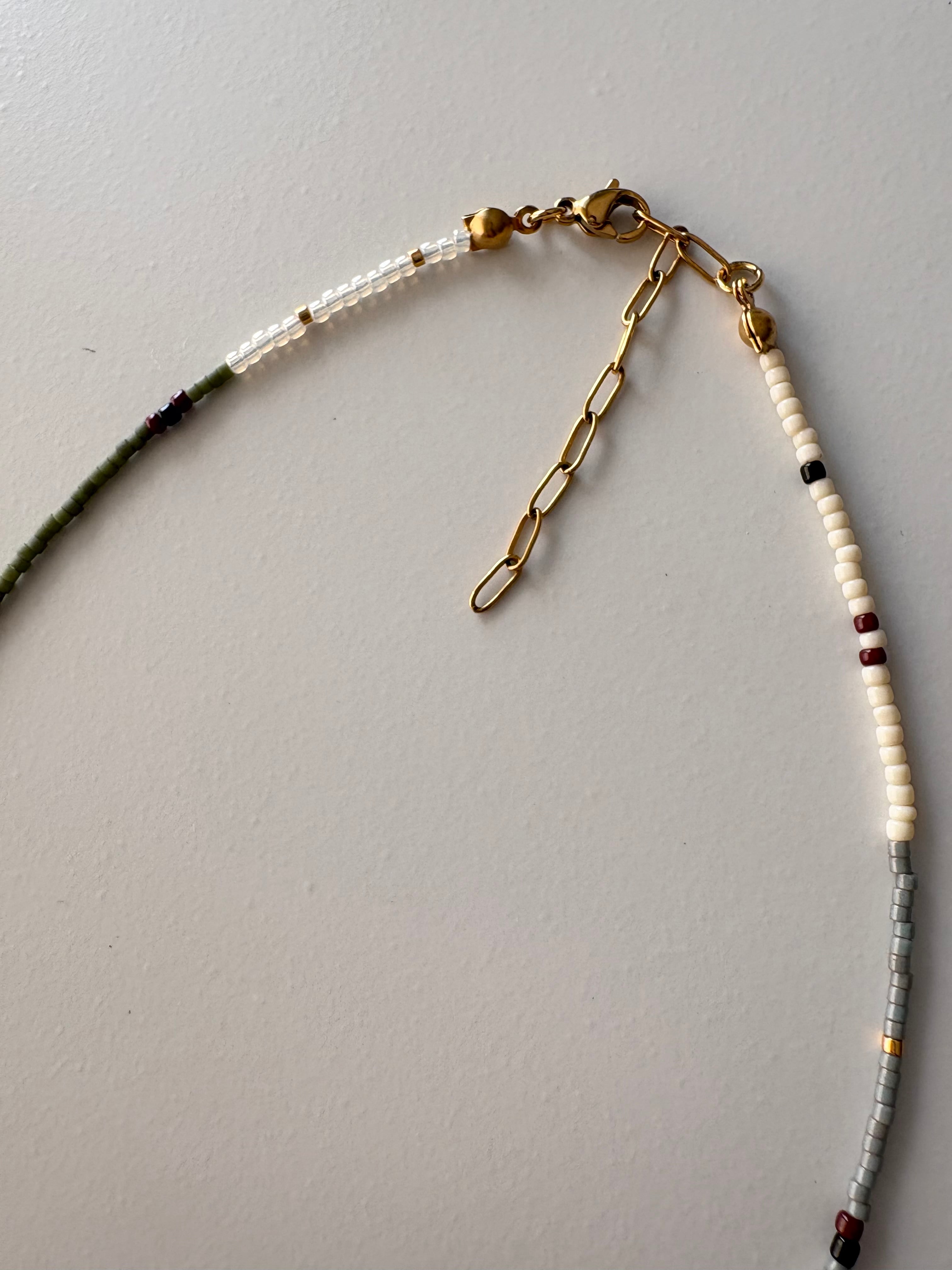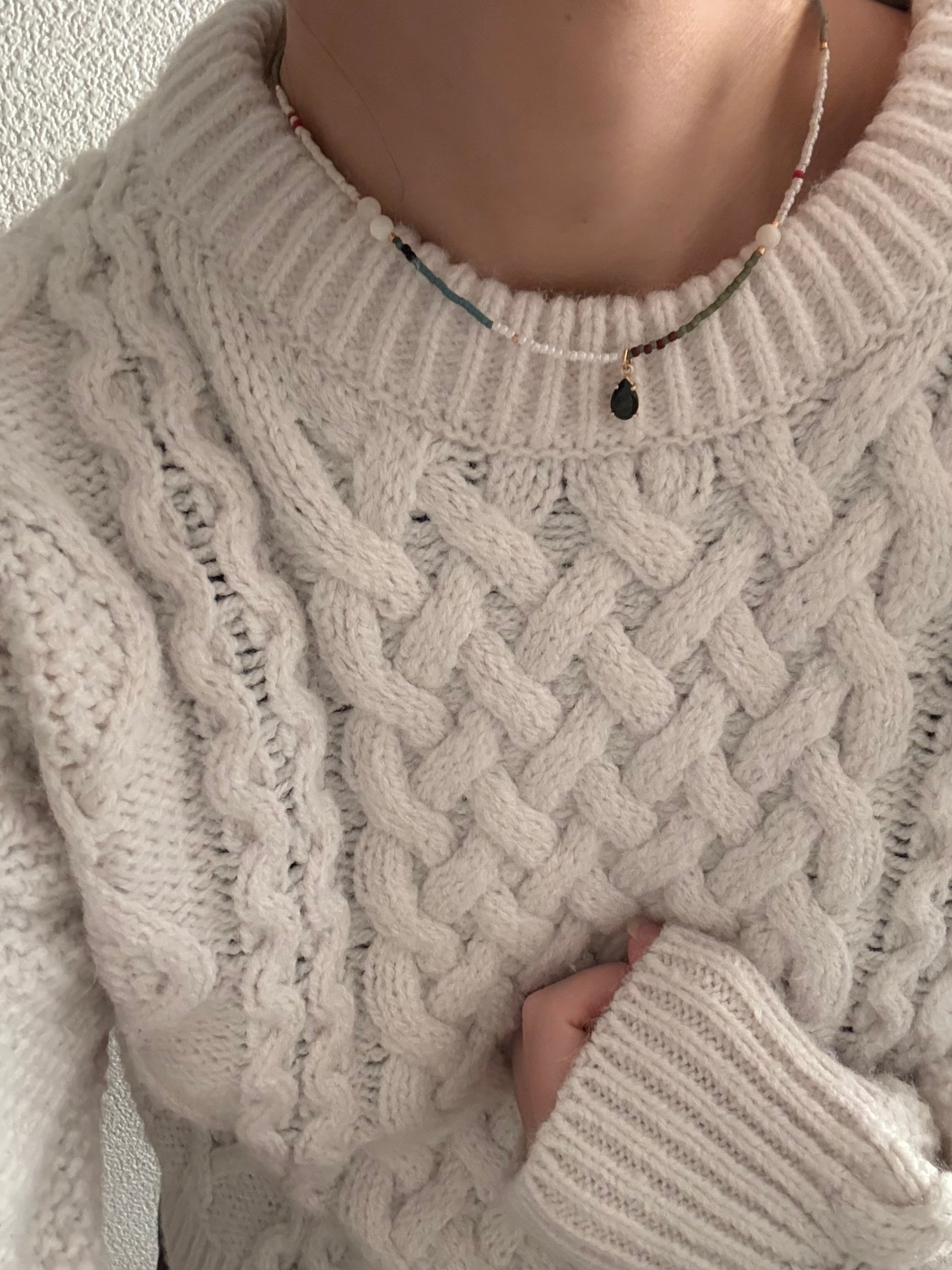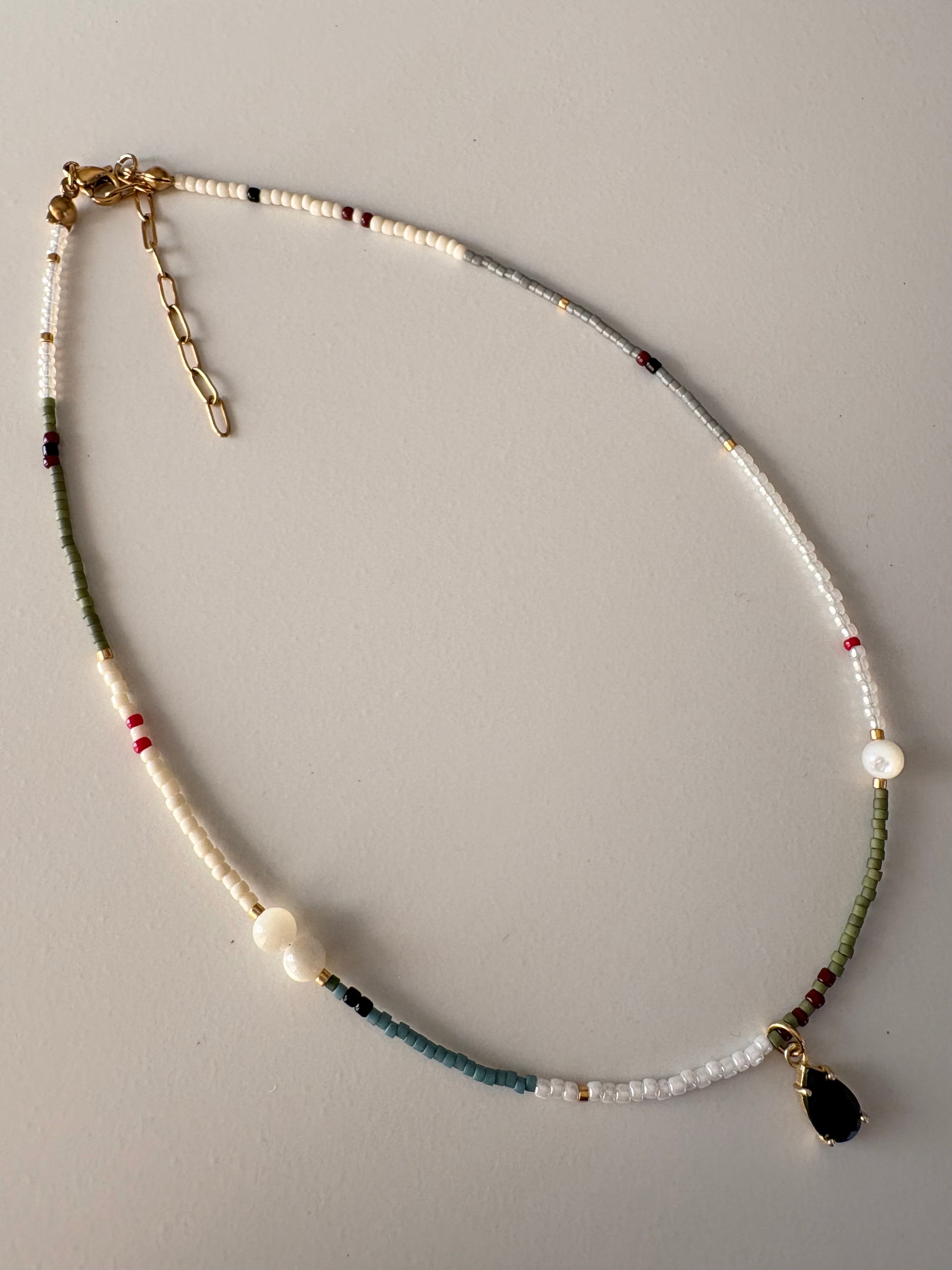 シャープな印象のブラックスピネルですが,そこにホワイトシェルと白色のビーズを多めに組むことで柔らかい印象に。