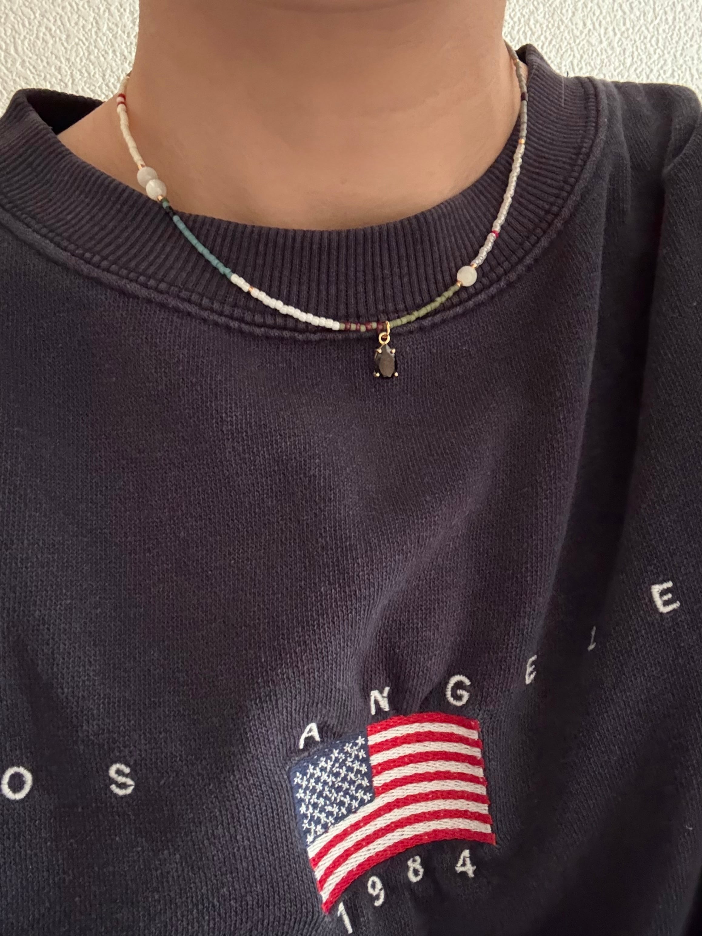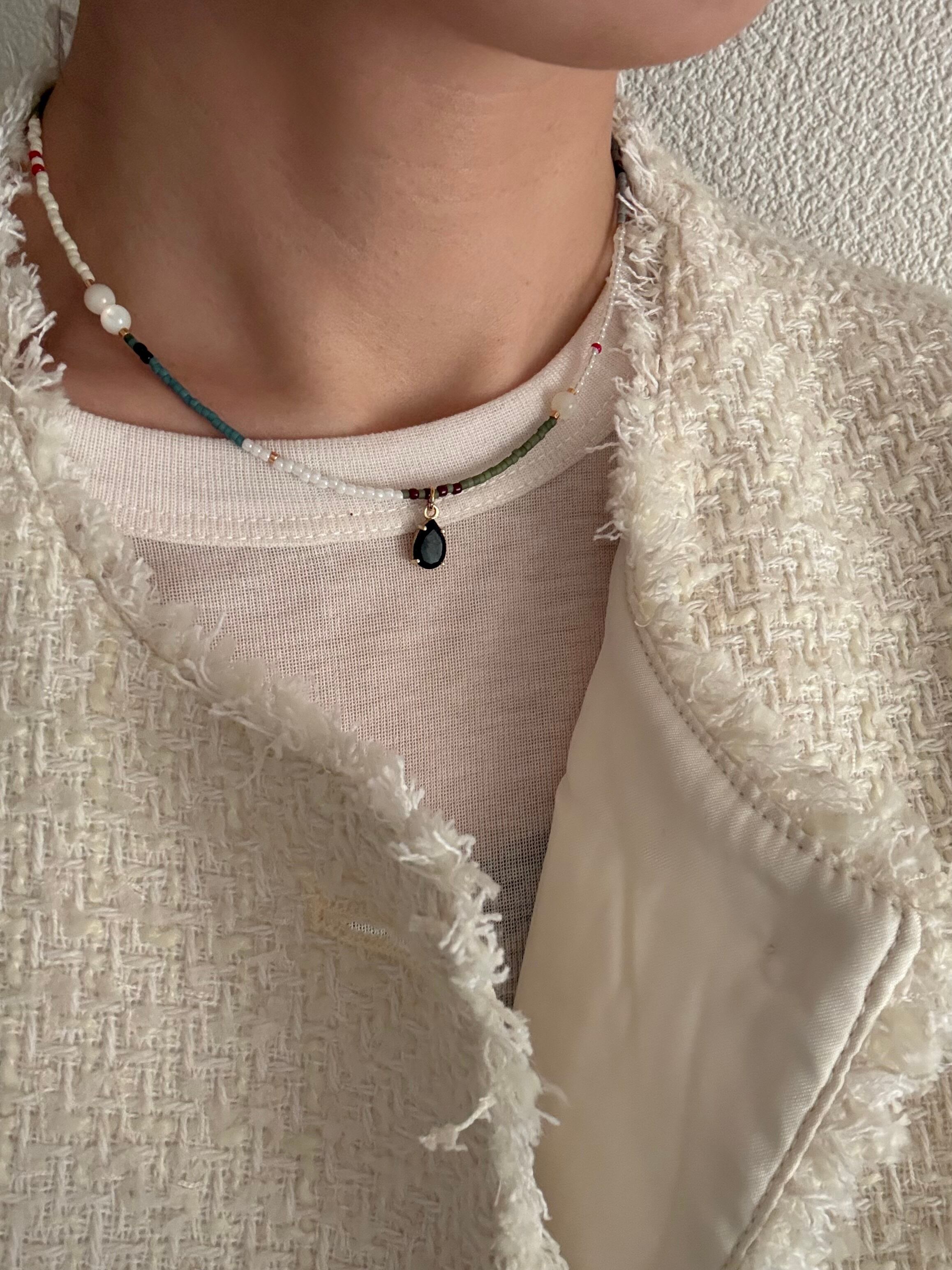 ブラックスピネルとホワイトシェルのモノトーン配色と石の質感が大人っぽさもあり,カジュアルになりすぎず綺麗めの洋服に合わせても素敵です。