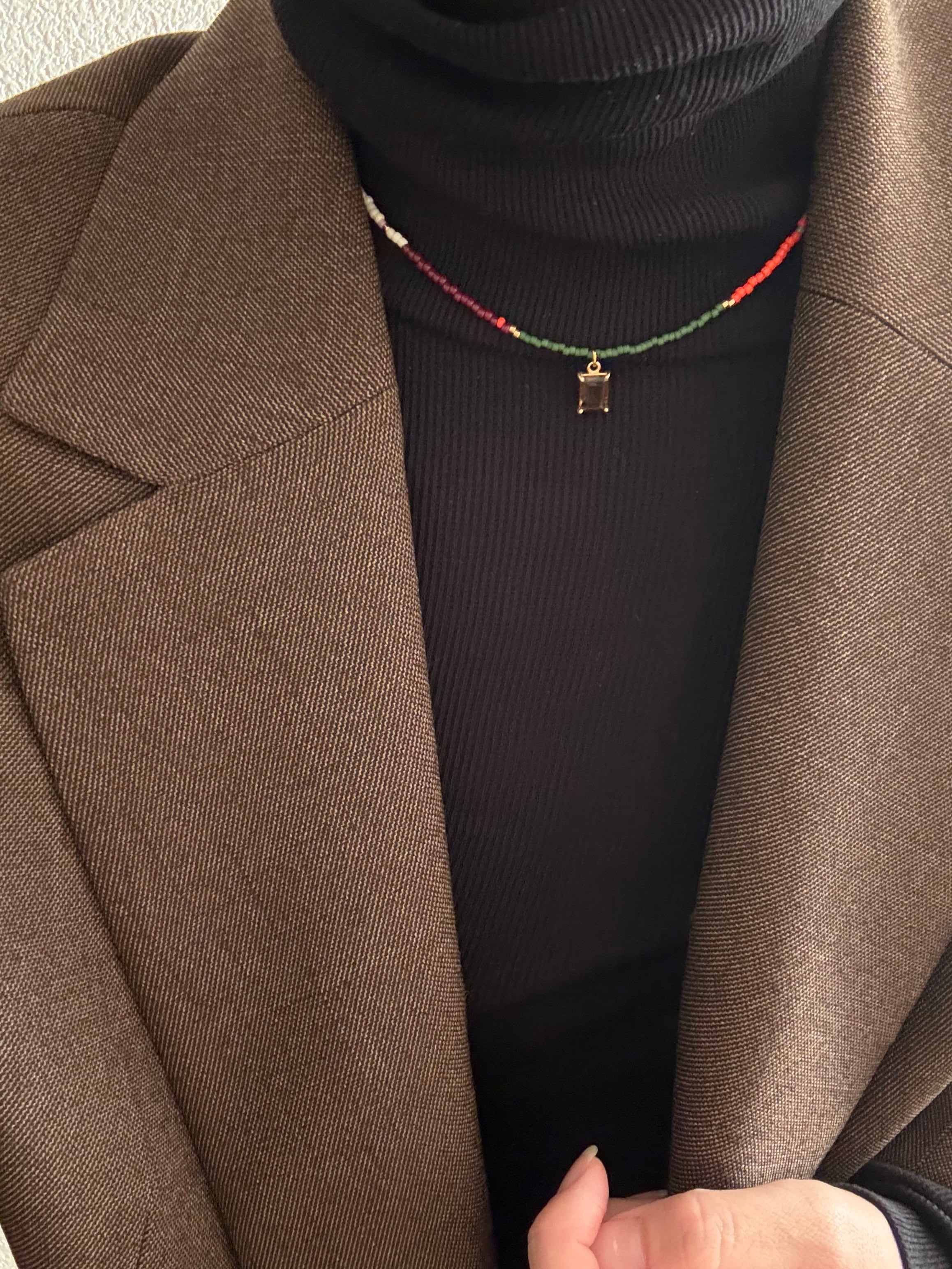 スモーキークォーツのブラウンが落ち着いていて,どんなスタイルの洋服とも相性がいいので,カジュアルから綺麗めまで幅広く合わせやすいです。