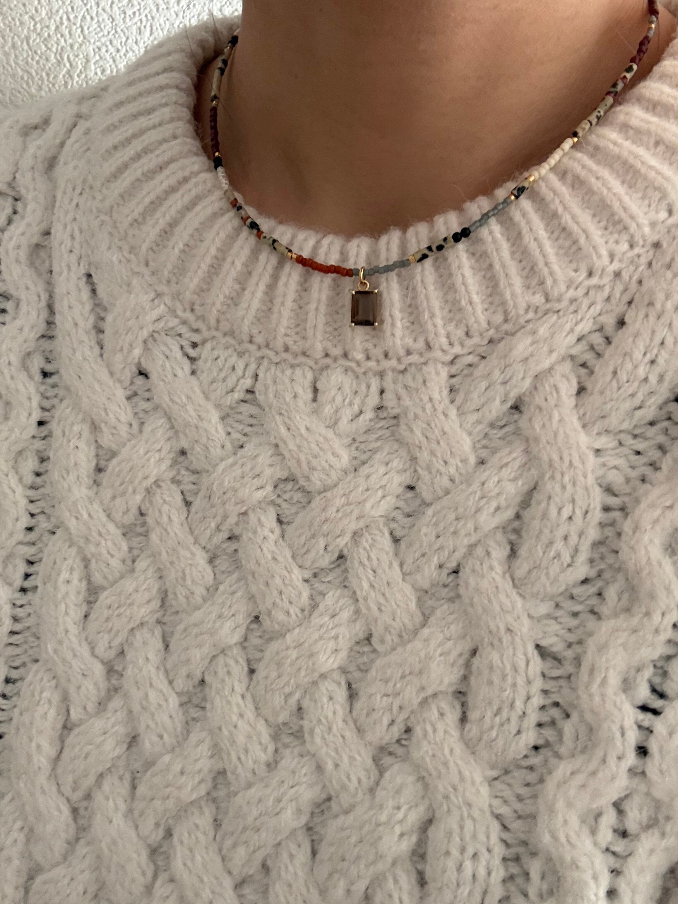 トップのスモーキークォーツの雰囲気も相まって大人になった今だから似あうそんな大人カジュアルネックレスになっています。