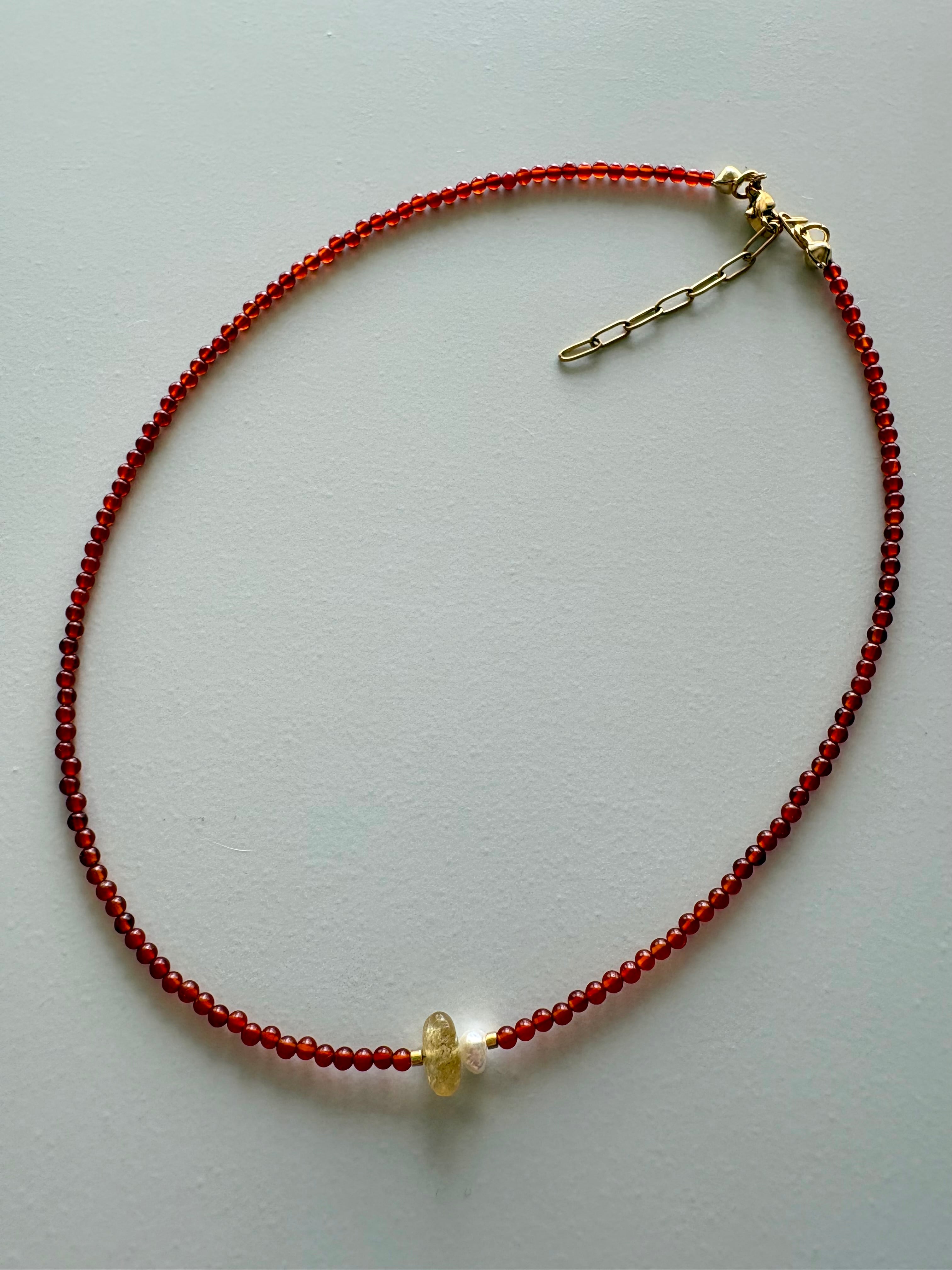 レッドアゲートの深みのある赤が首元でよく映えます。