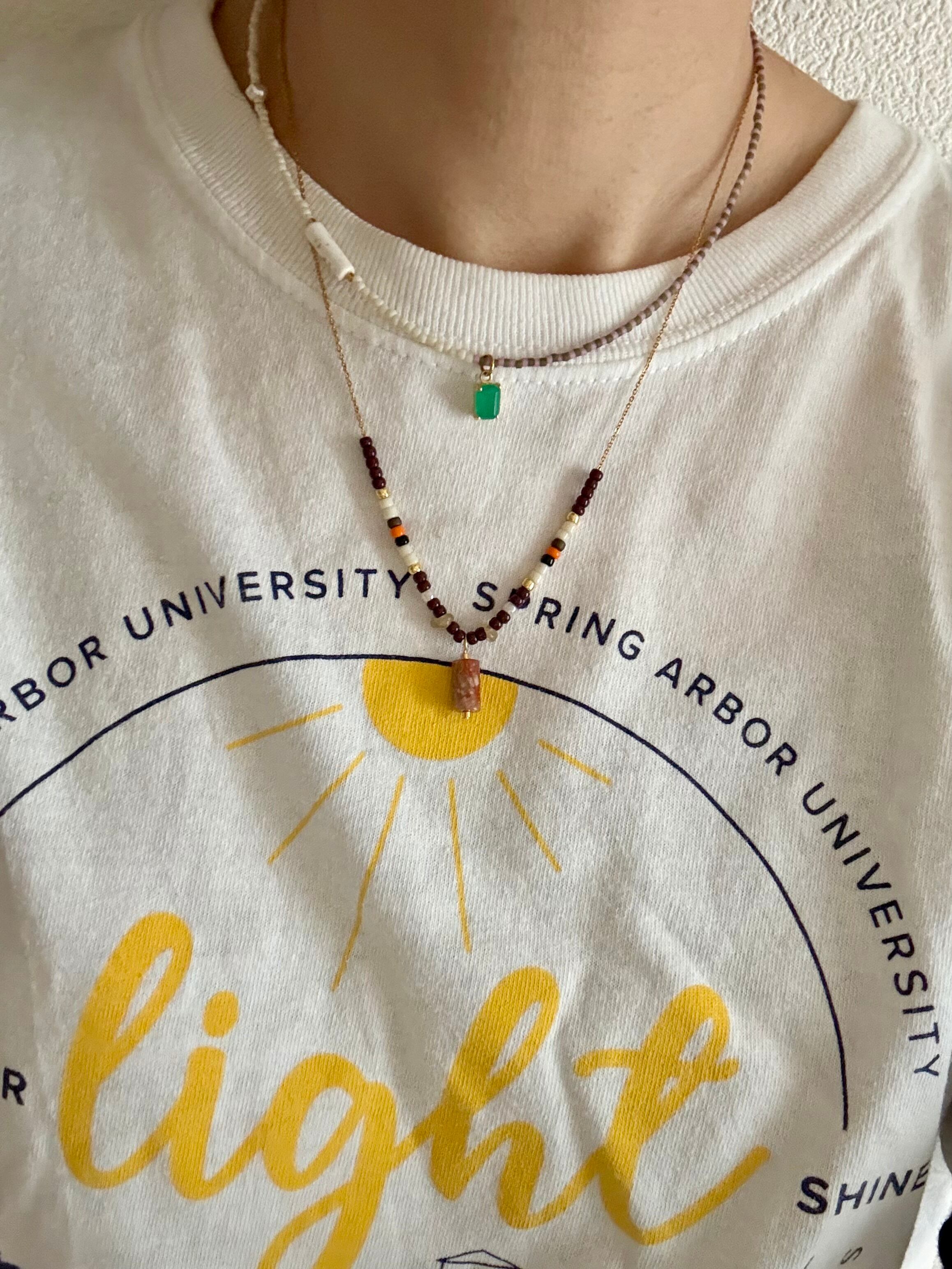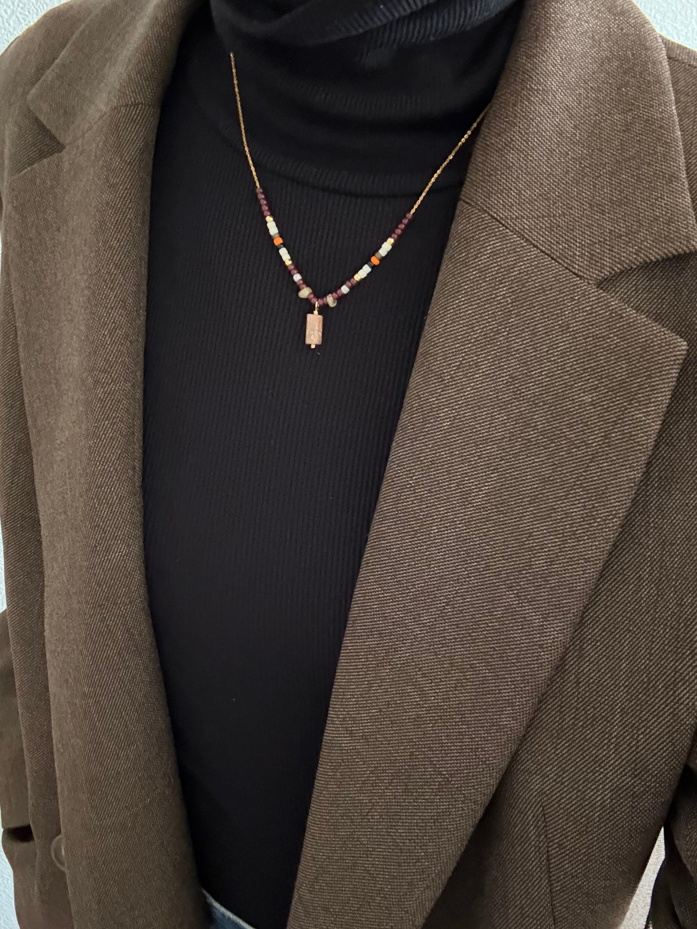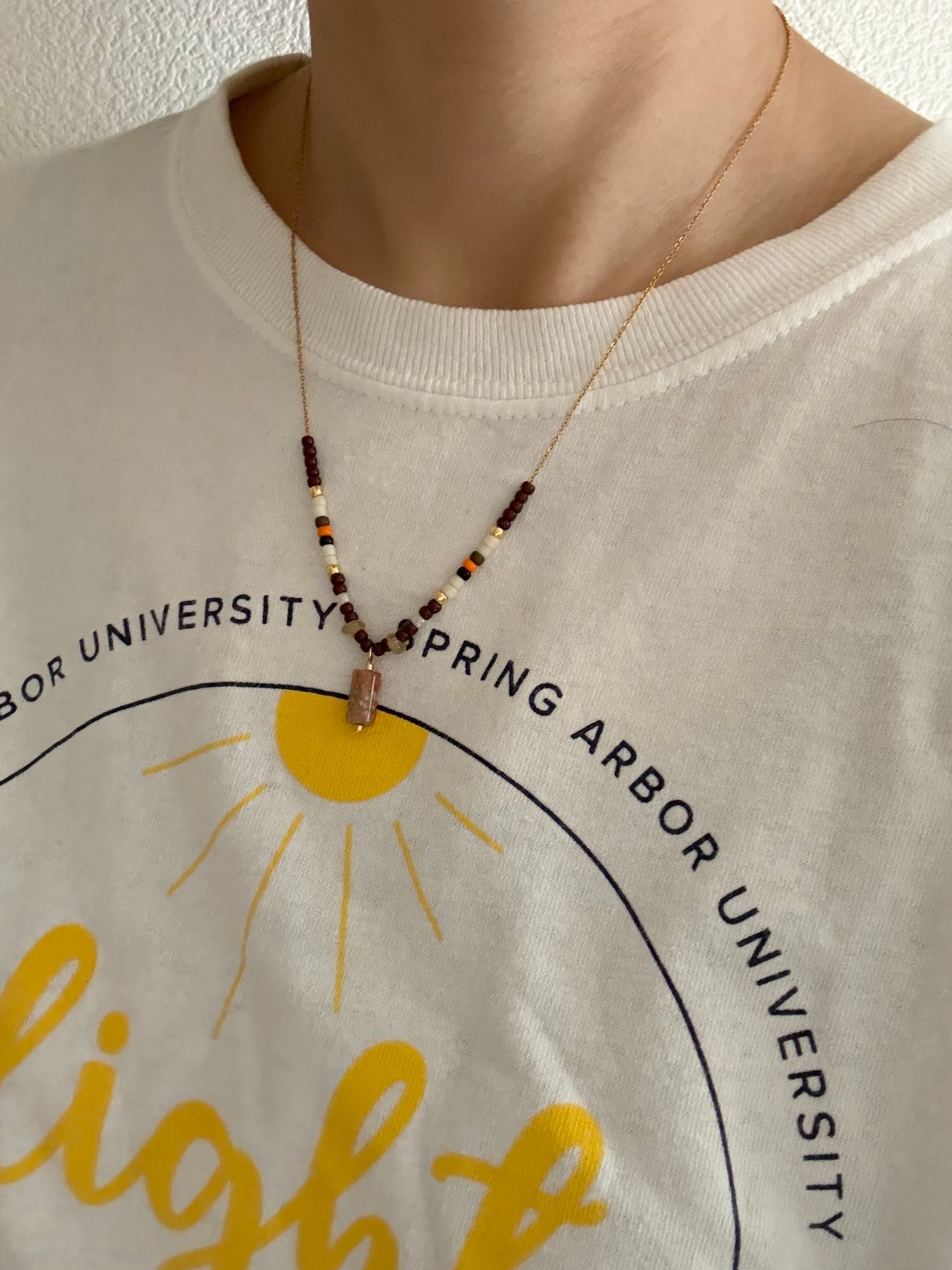 ピンクモスアゲートのピンクが少しスモーキーがかっていて大人の雰囲気だったので,それに合わせてブラウンを中心に配色してみました。