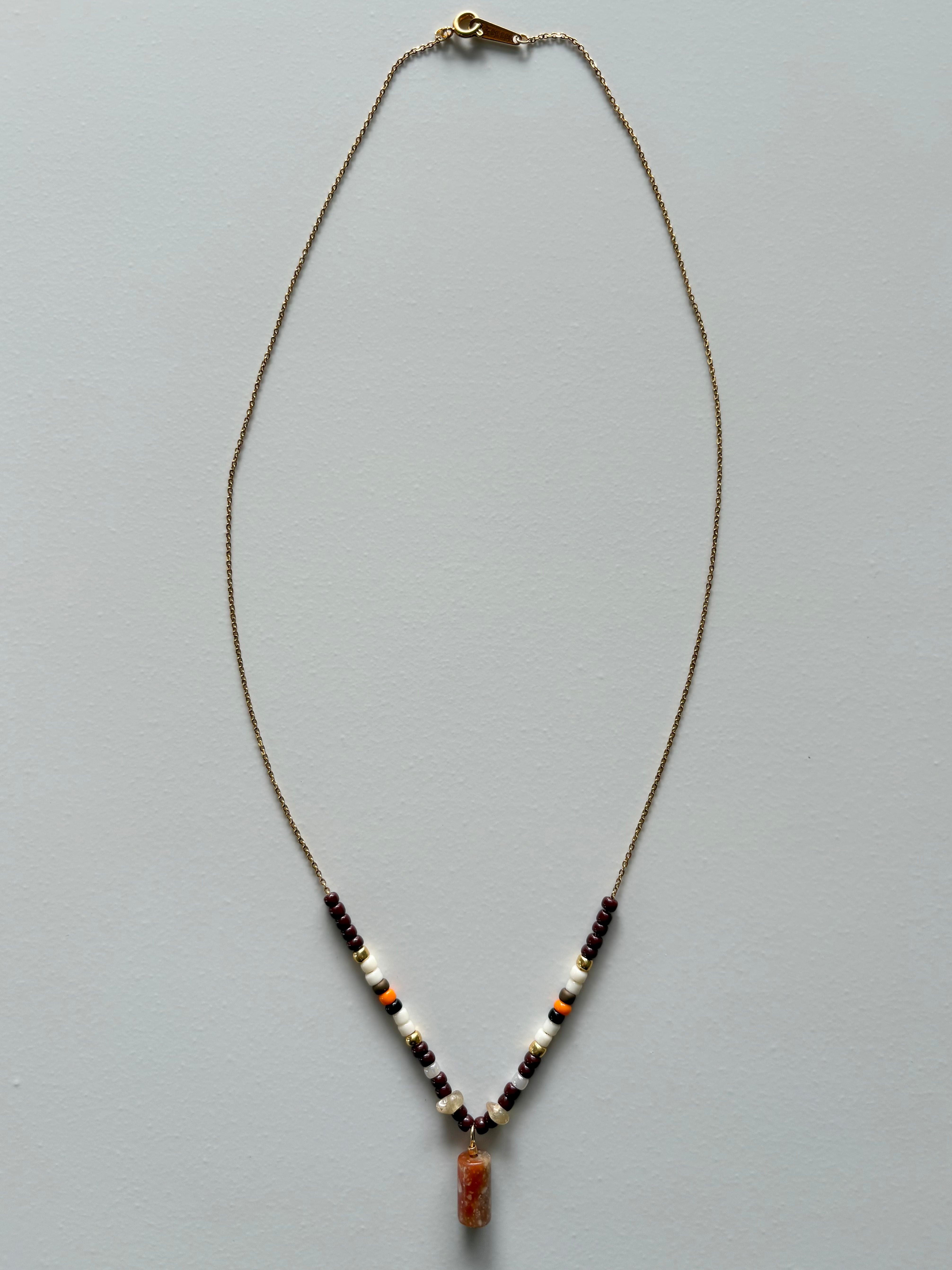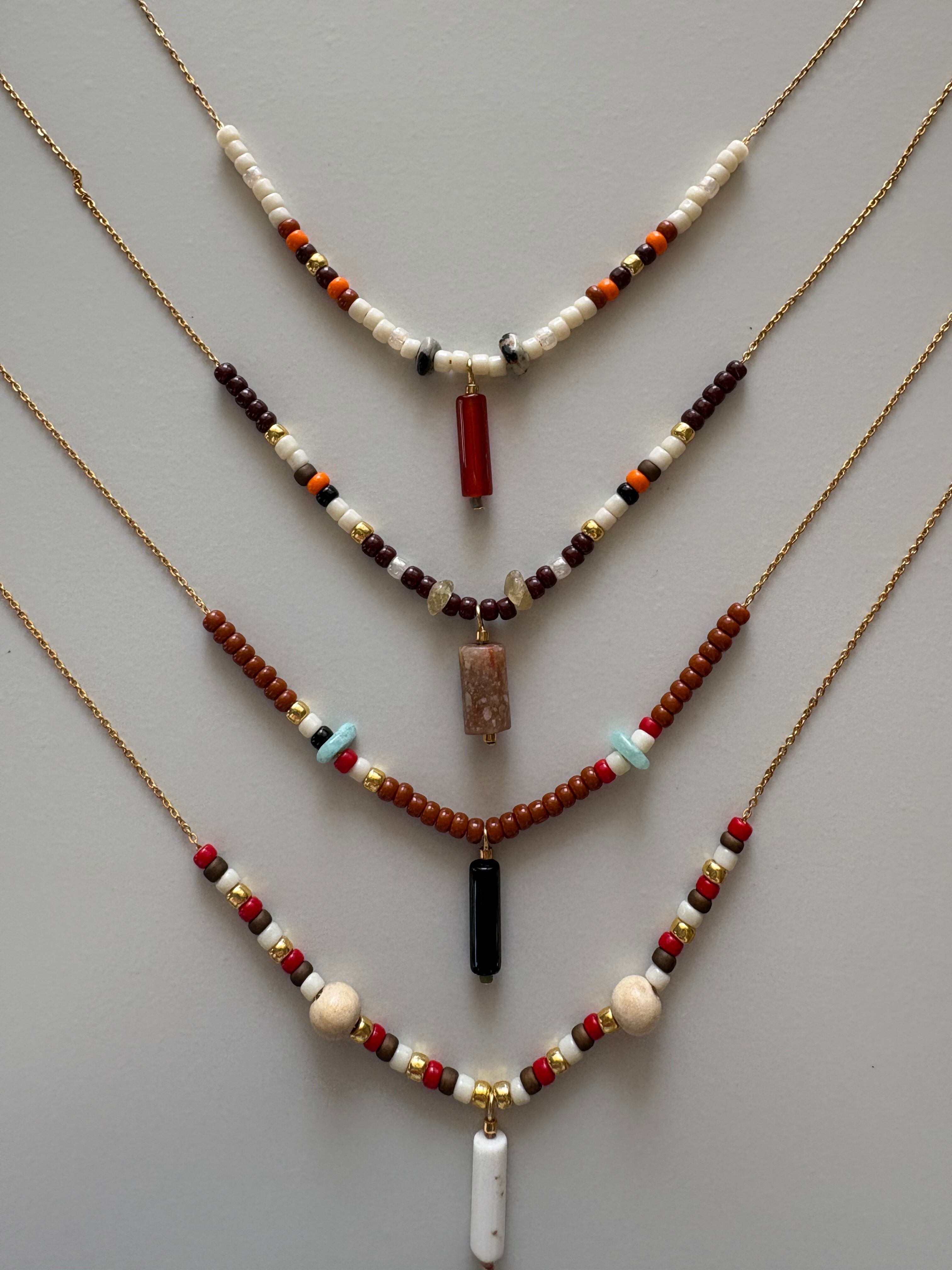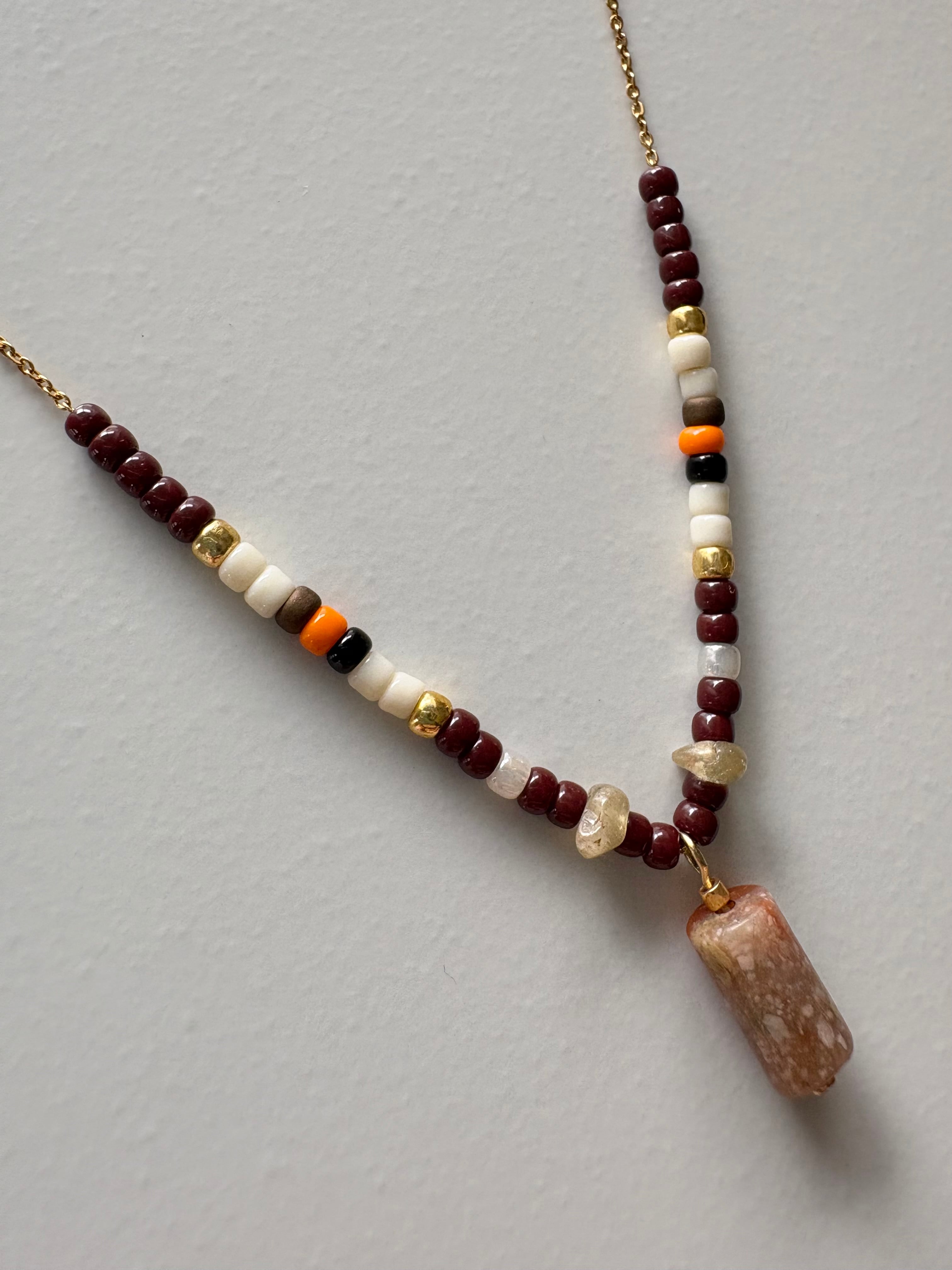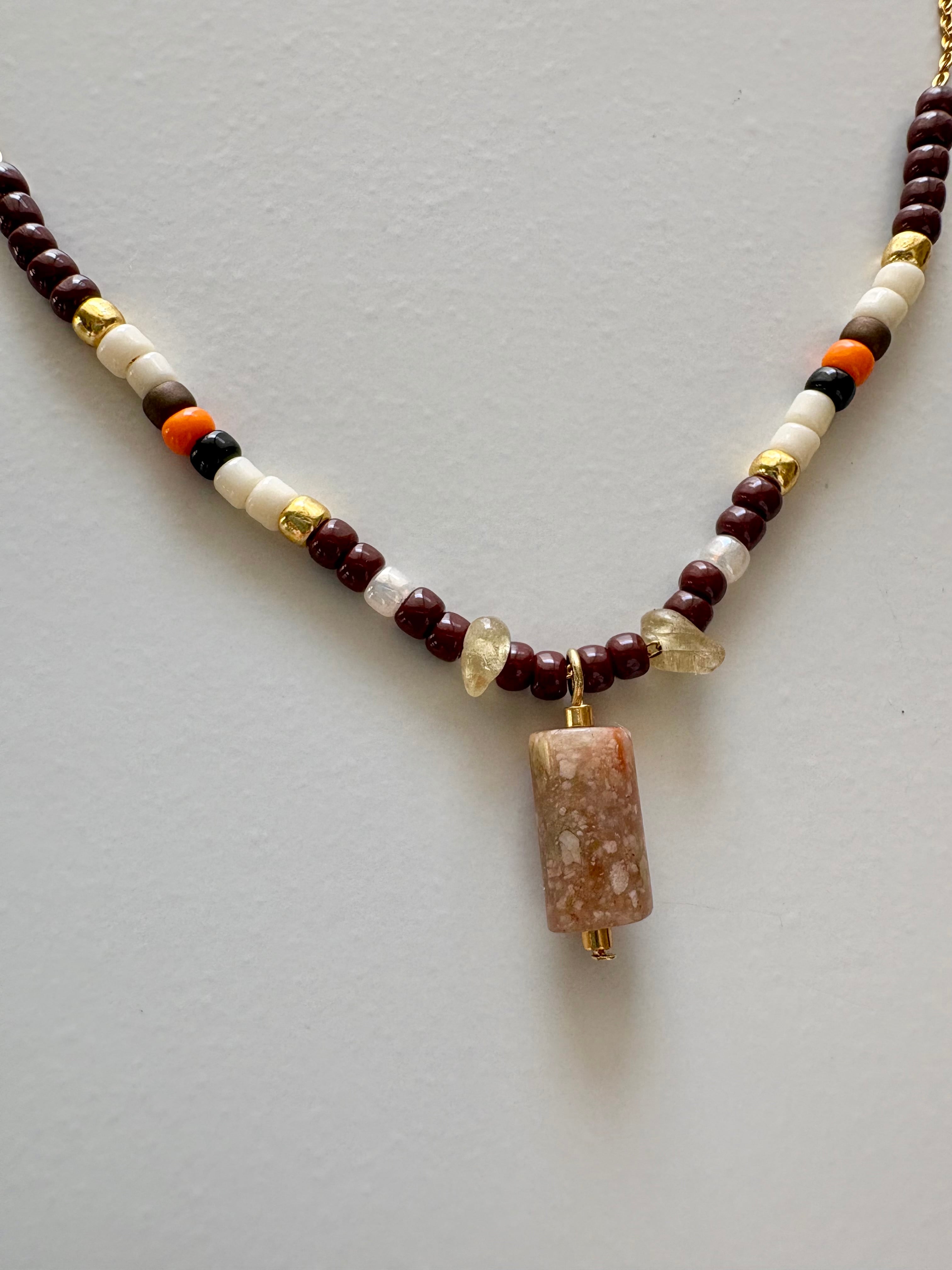 ピンクモスアゲートのピンクが少しスモーキーがかっていて大人の雰囲気だったので,それに合わせてブラウンを中心に配色してみました。