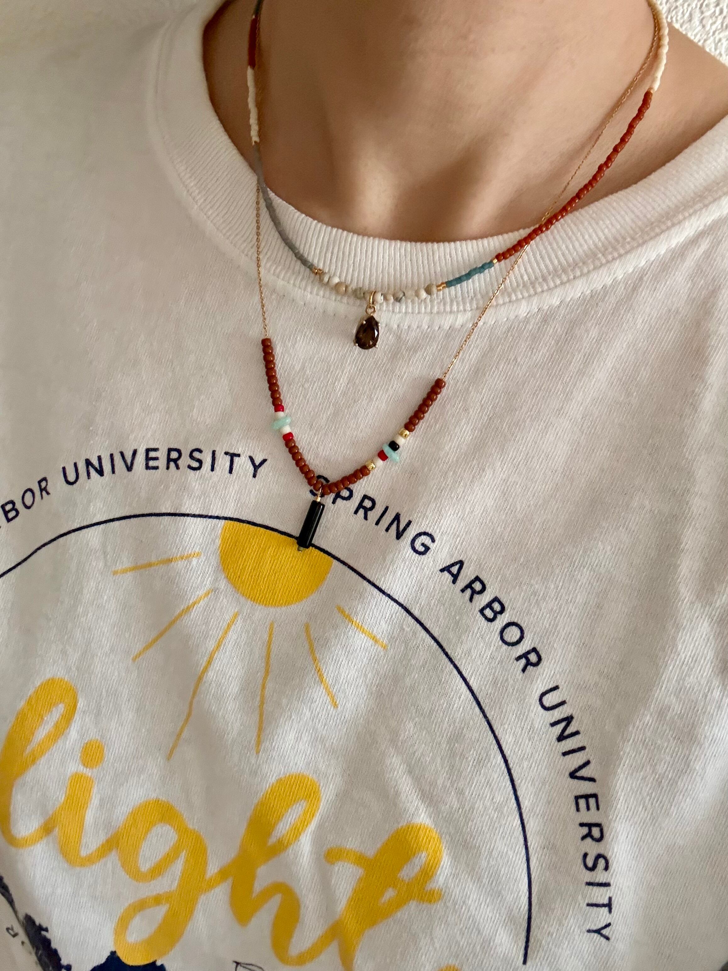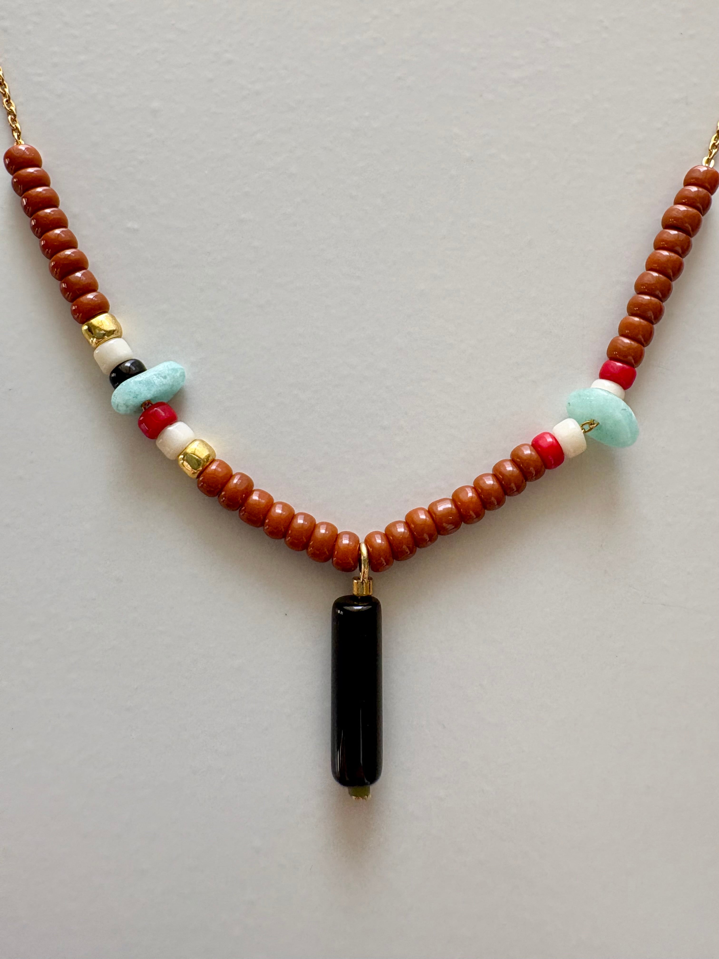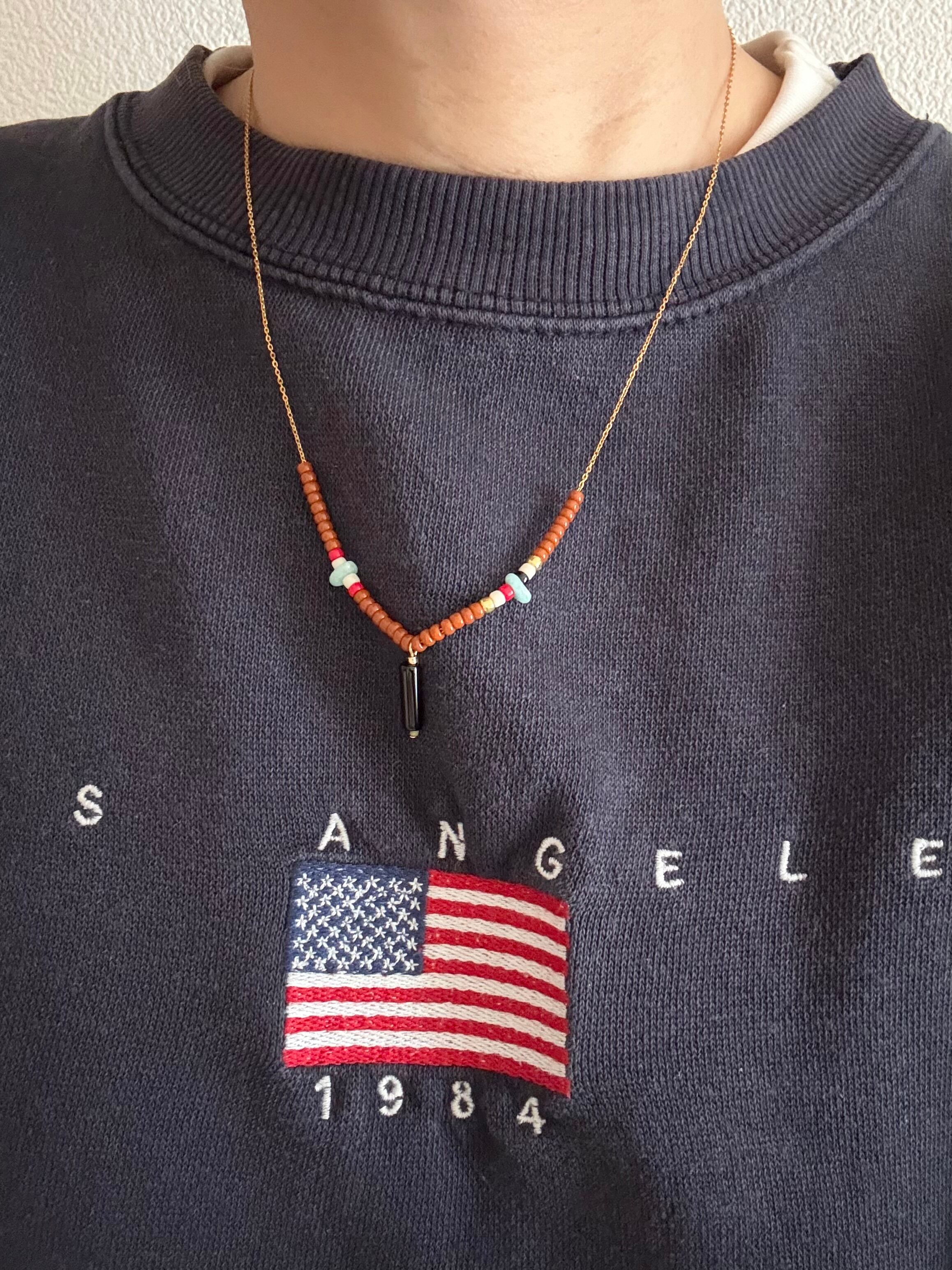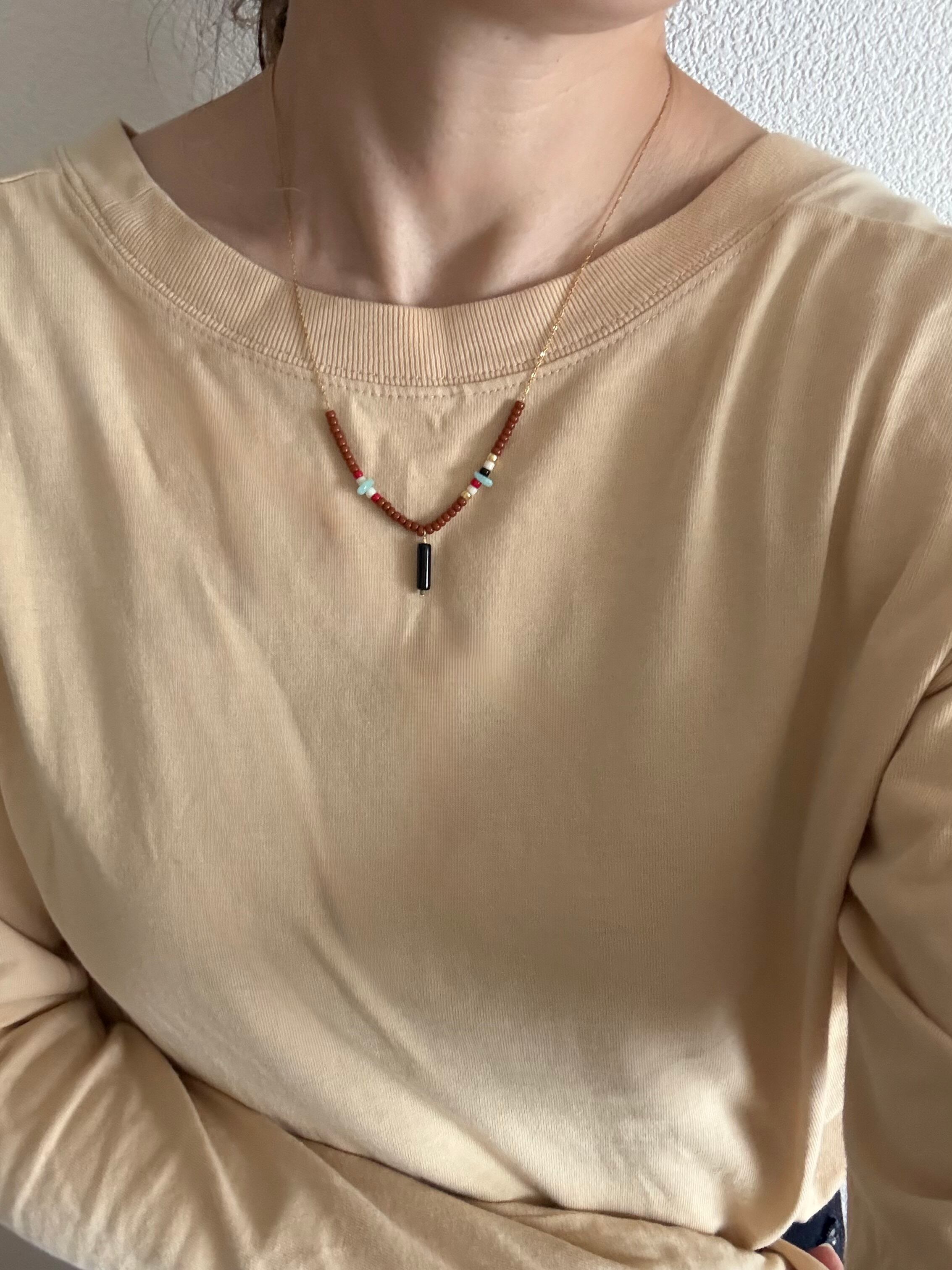 全体的に落ち着いた色味の中で,ポイントで置いたアマゾナイトの水色がよく映えます。