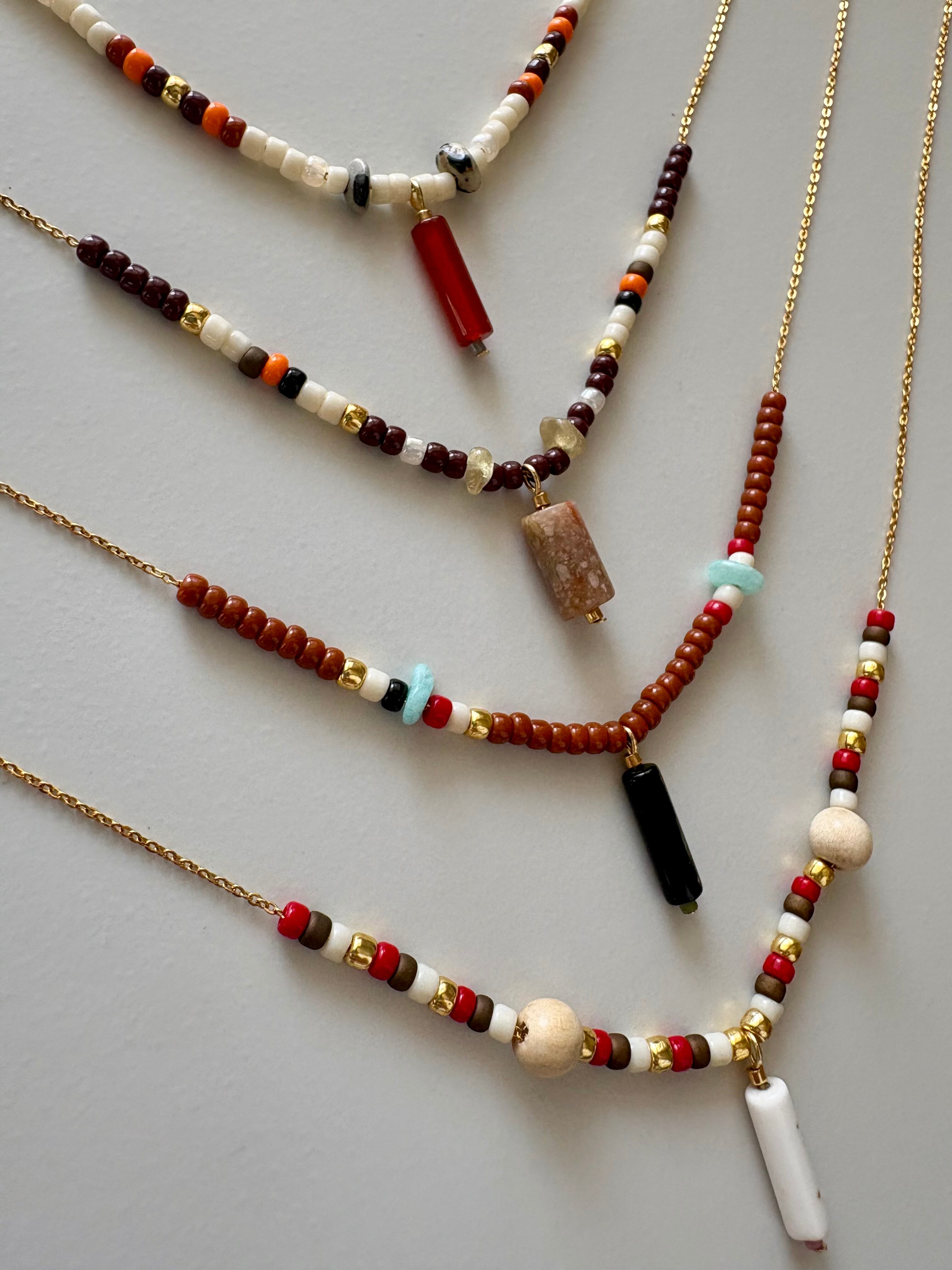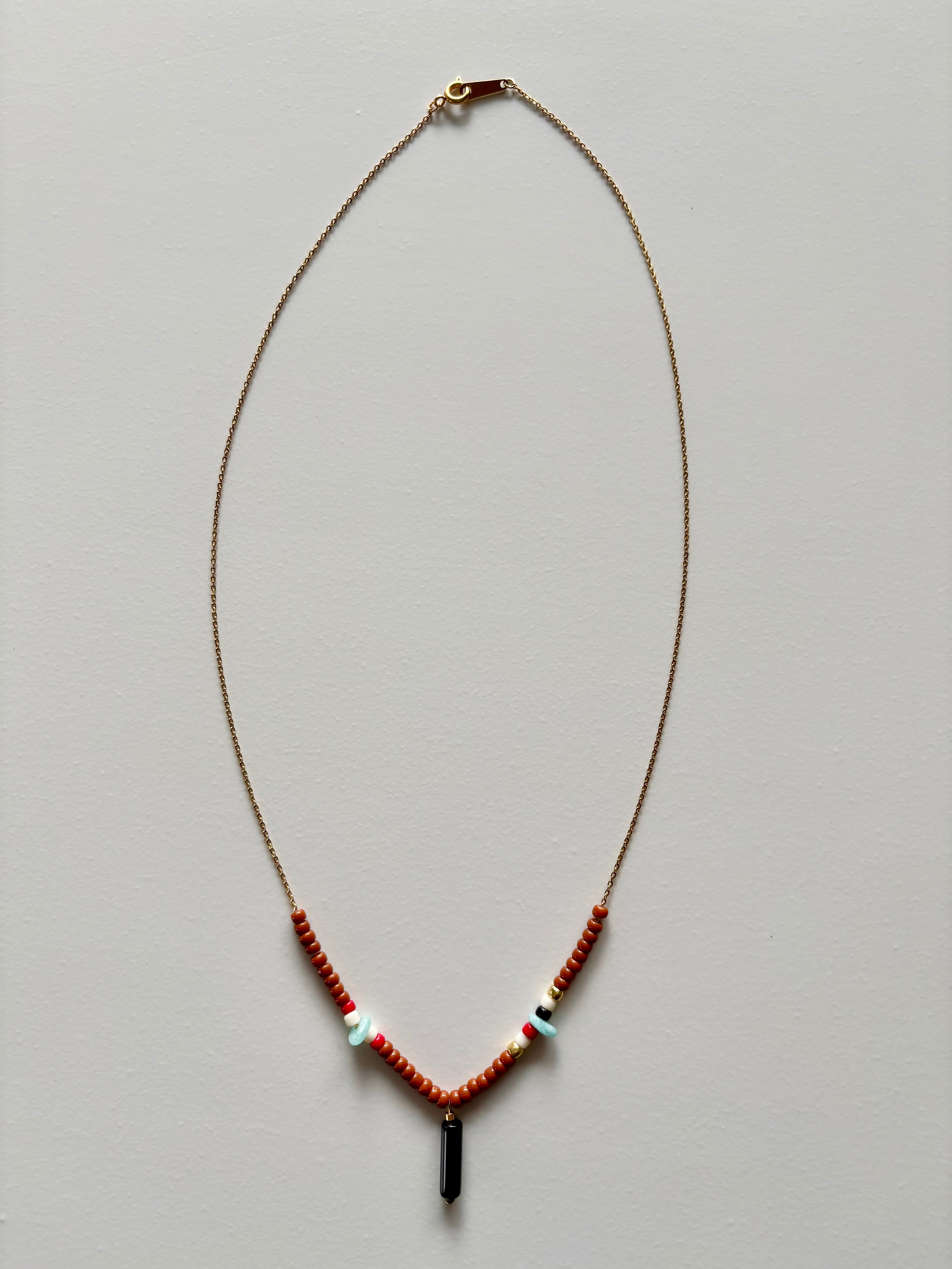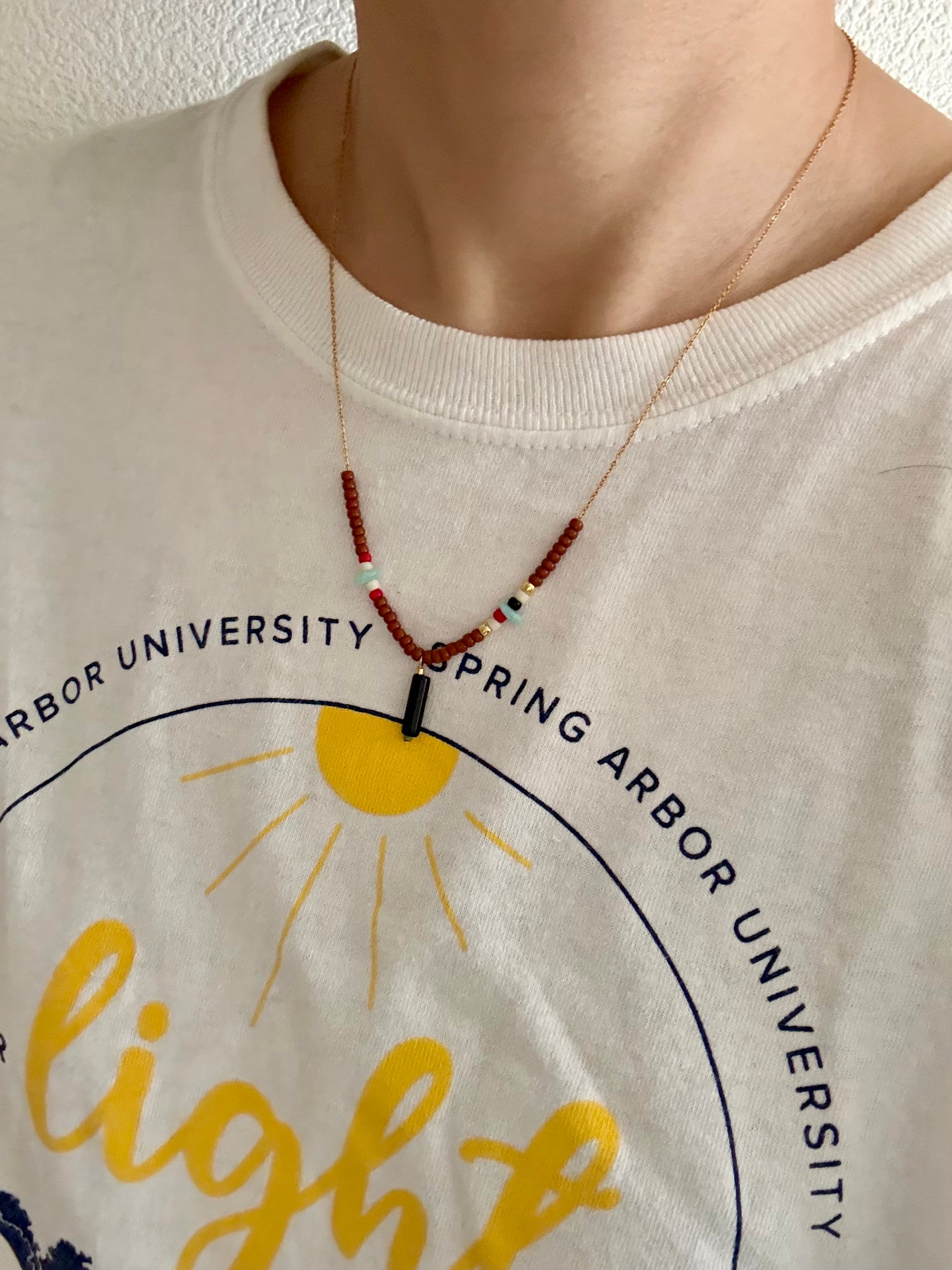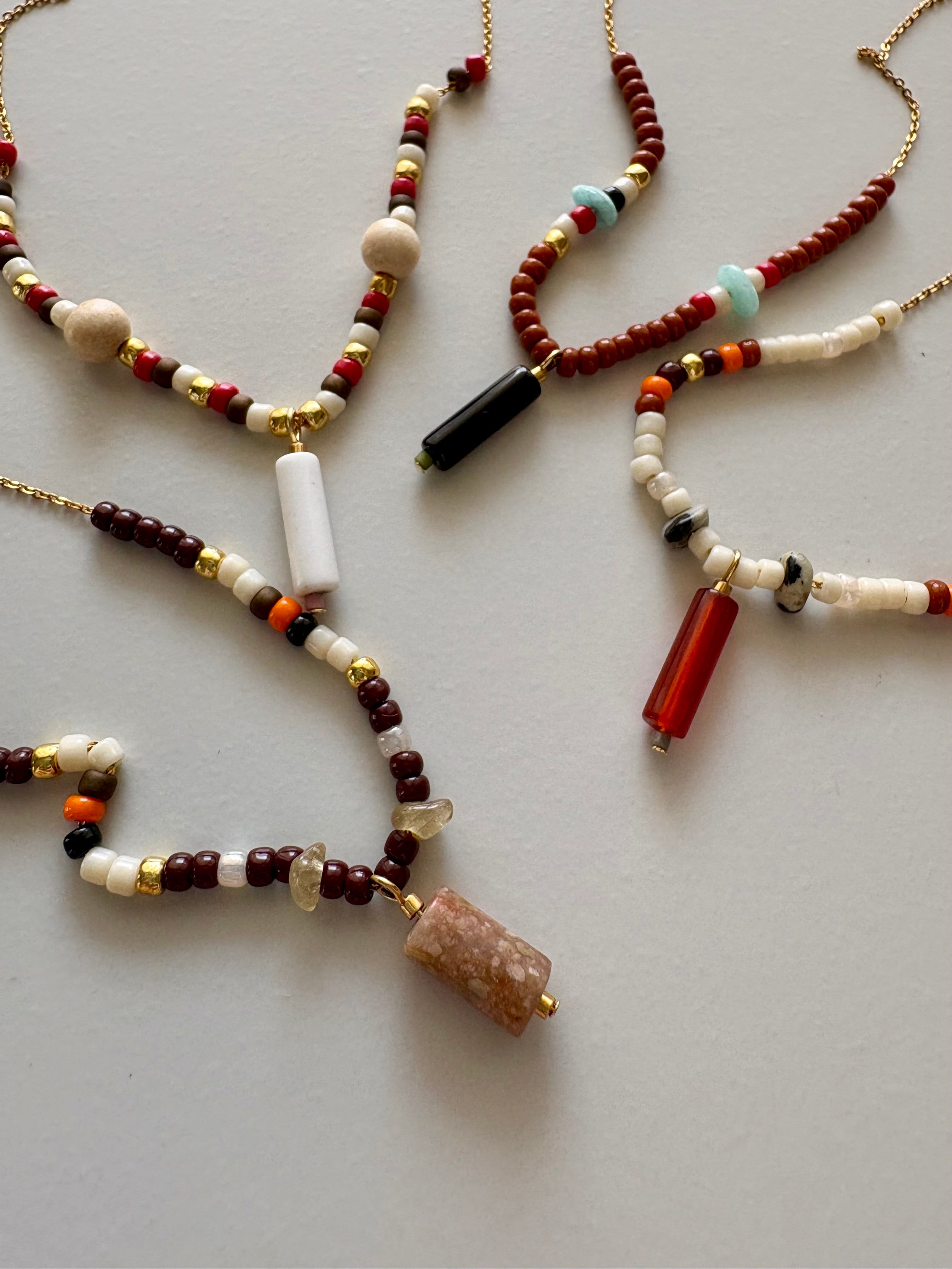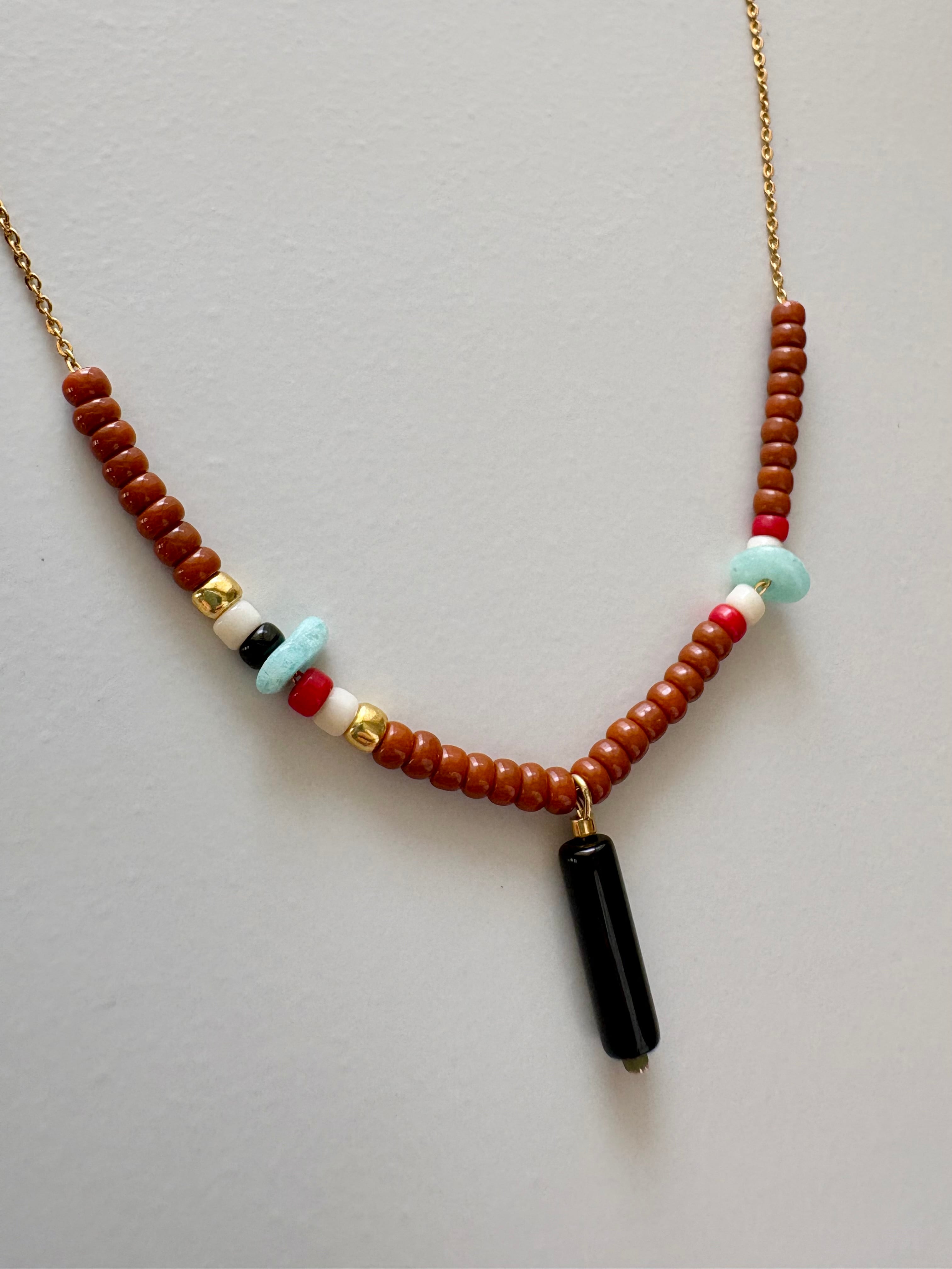 全体的に落ち着いた色味の中で,ポイントで置いたアマゾナイトの水色がよく映えます。