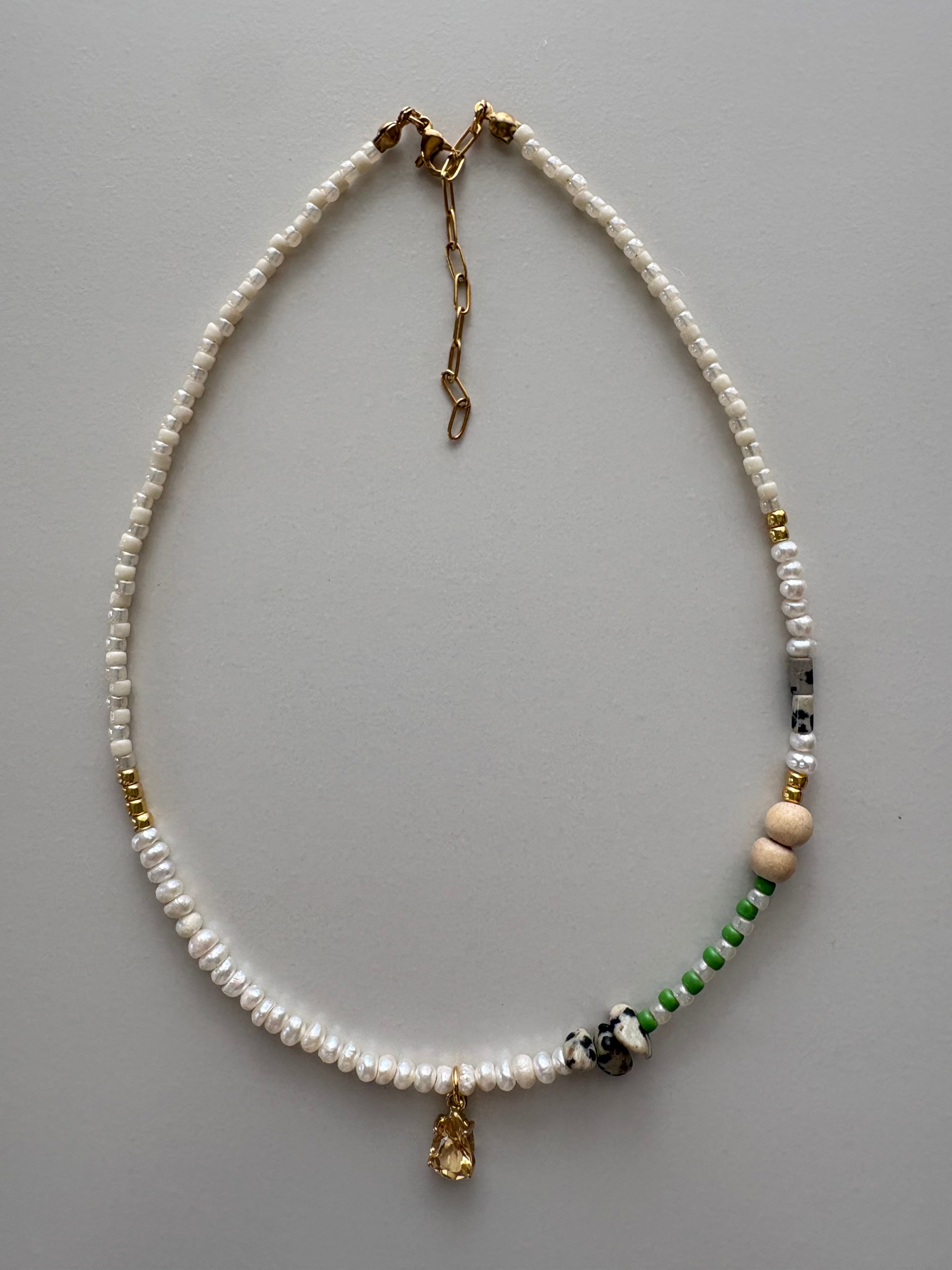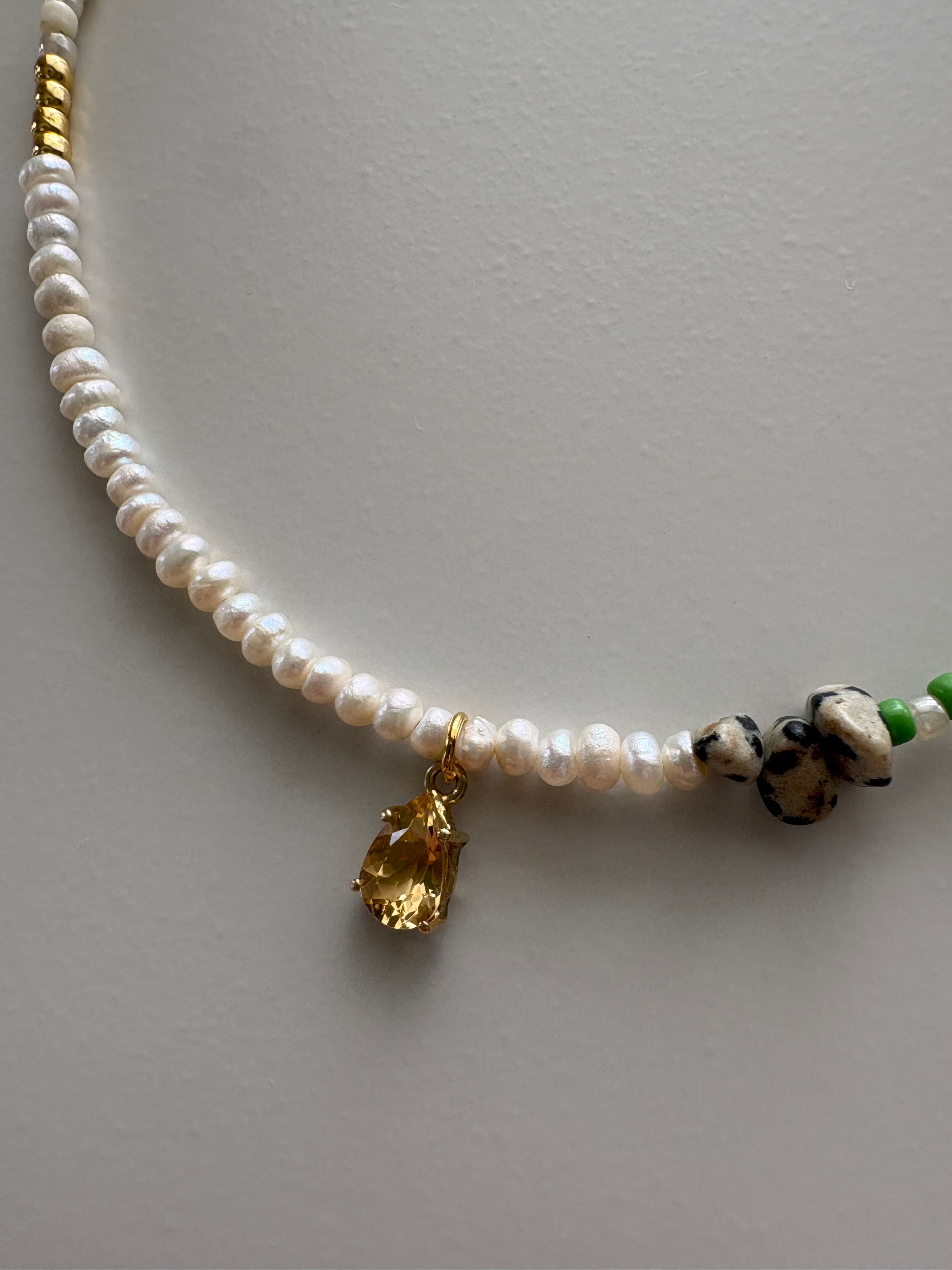 【素材】 ネックレストップ9×6mm(Citrine、石枠Silver925 K18コーティング)FleshWaterPearl、DalmatianJasper、WhiteWood、ビーズ、金具部分すべてサージカルステンレス
