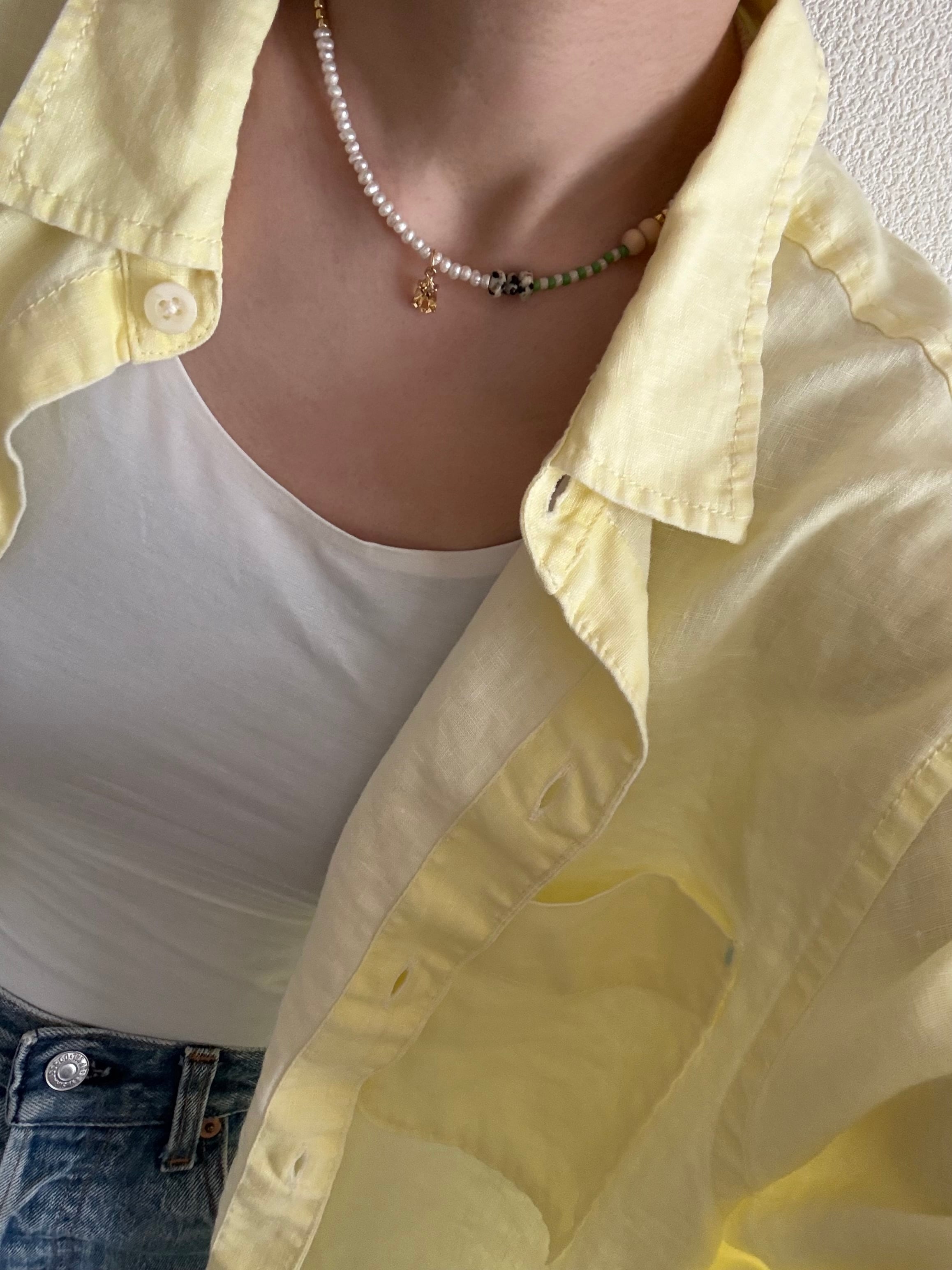 ダルメシアンジャスパーやホワイトウッドの石やビーズで程よいカジュアル感を出しました。