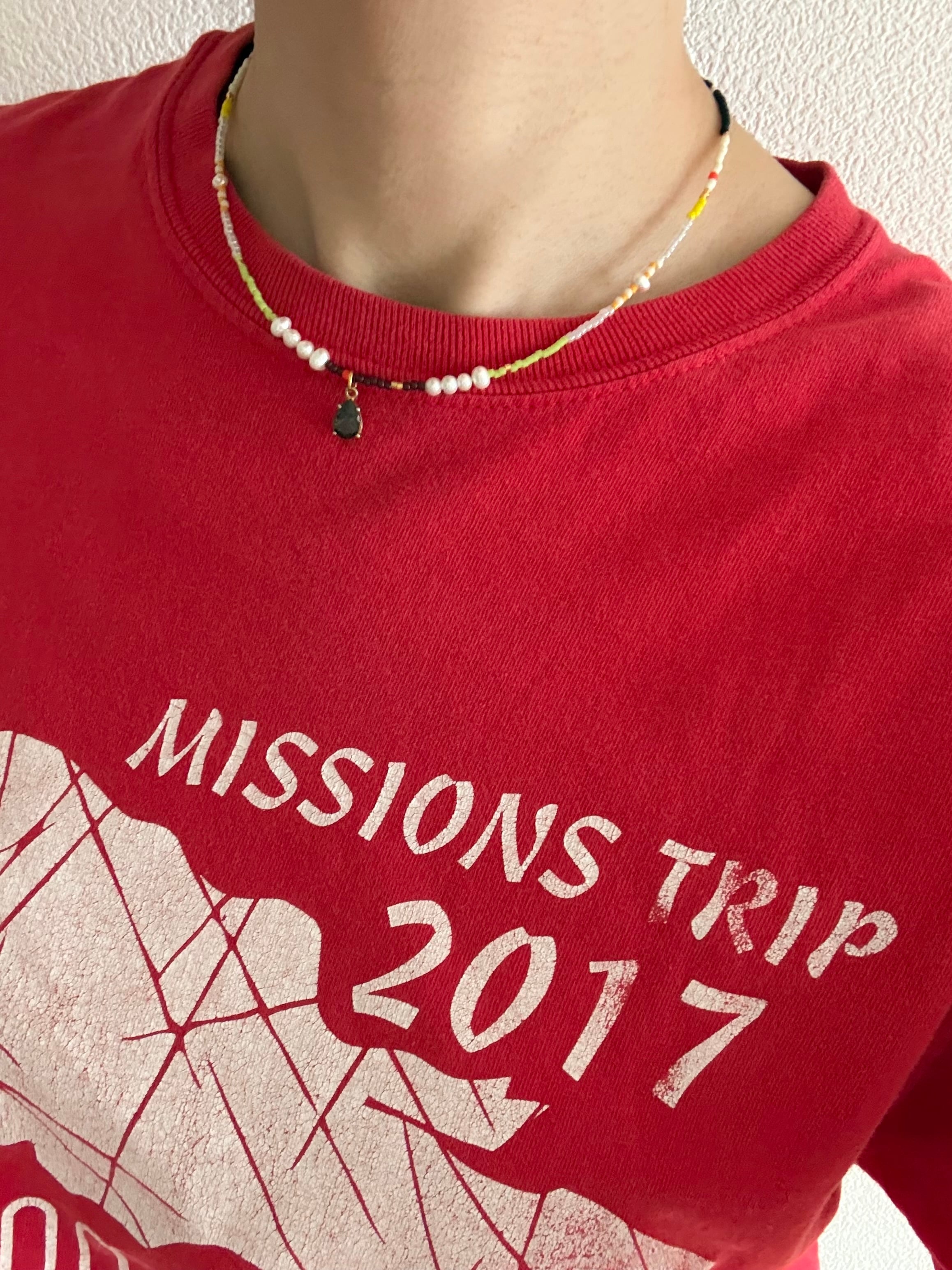 端にはダークカラーを持ってきて,抜け感と引き締めを両立した大人のカジュアルネックレスになっています。
