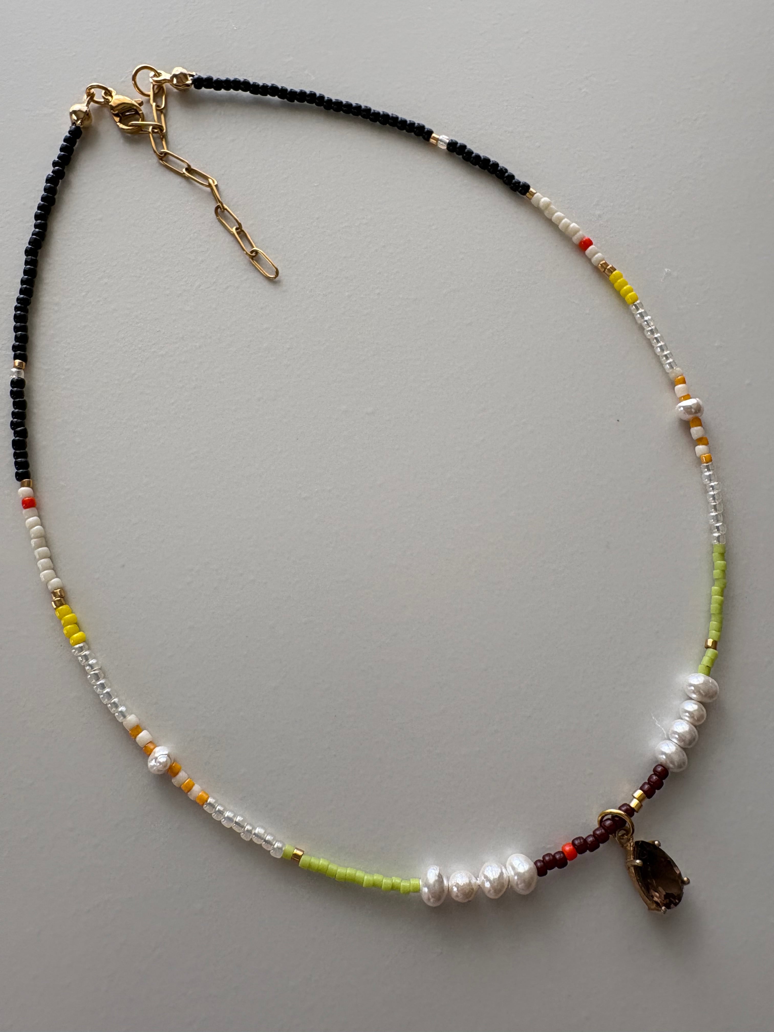 スモーキークォーツの落ち着きと,淡水パールの上品さをベースに明るめのビーズで組みました。