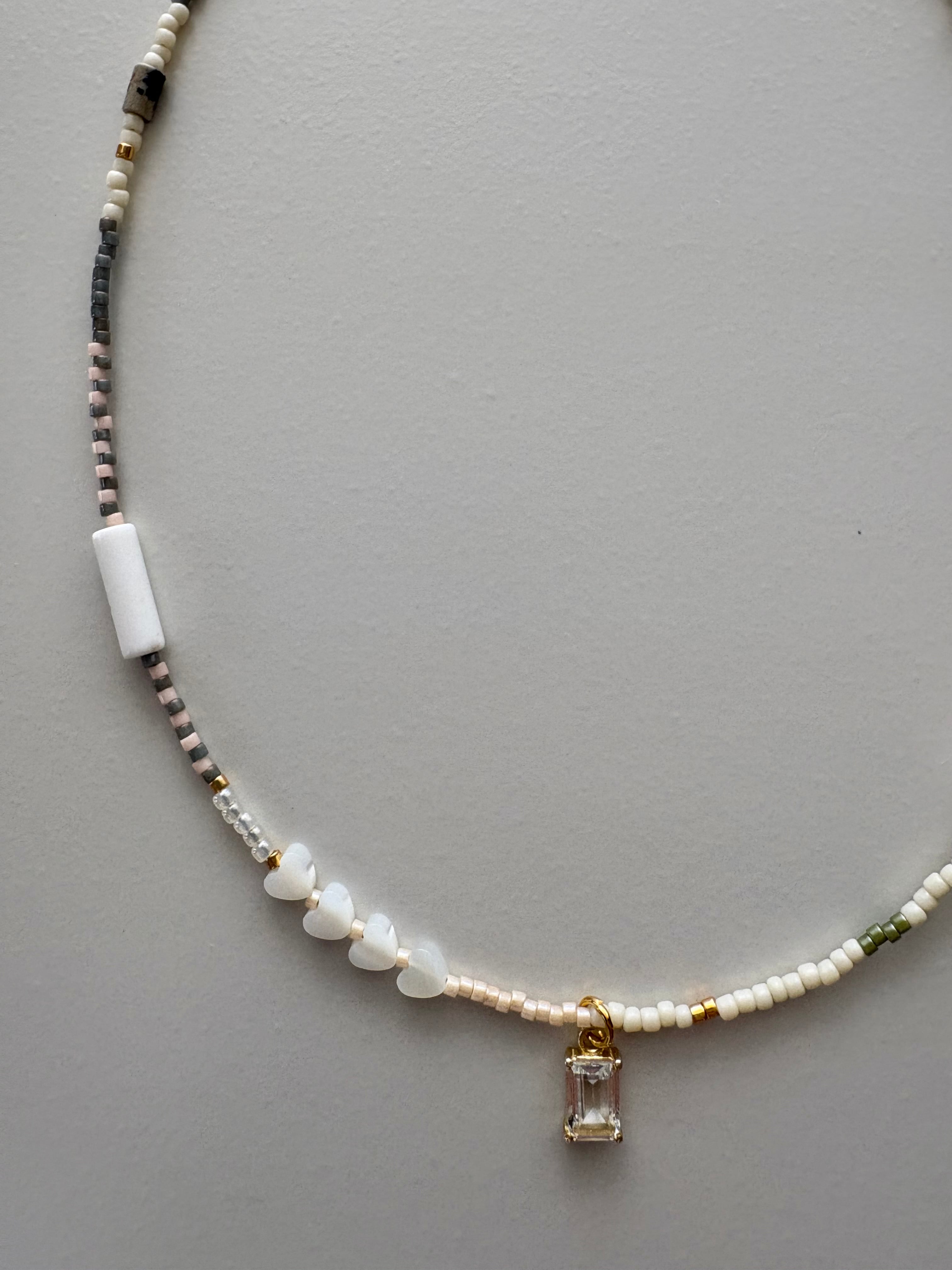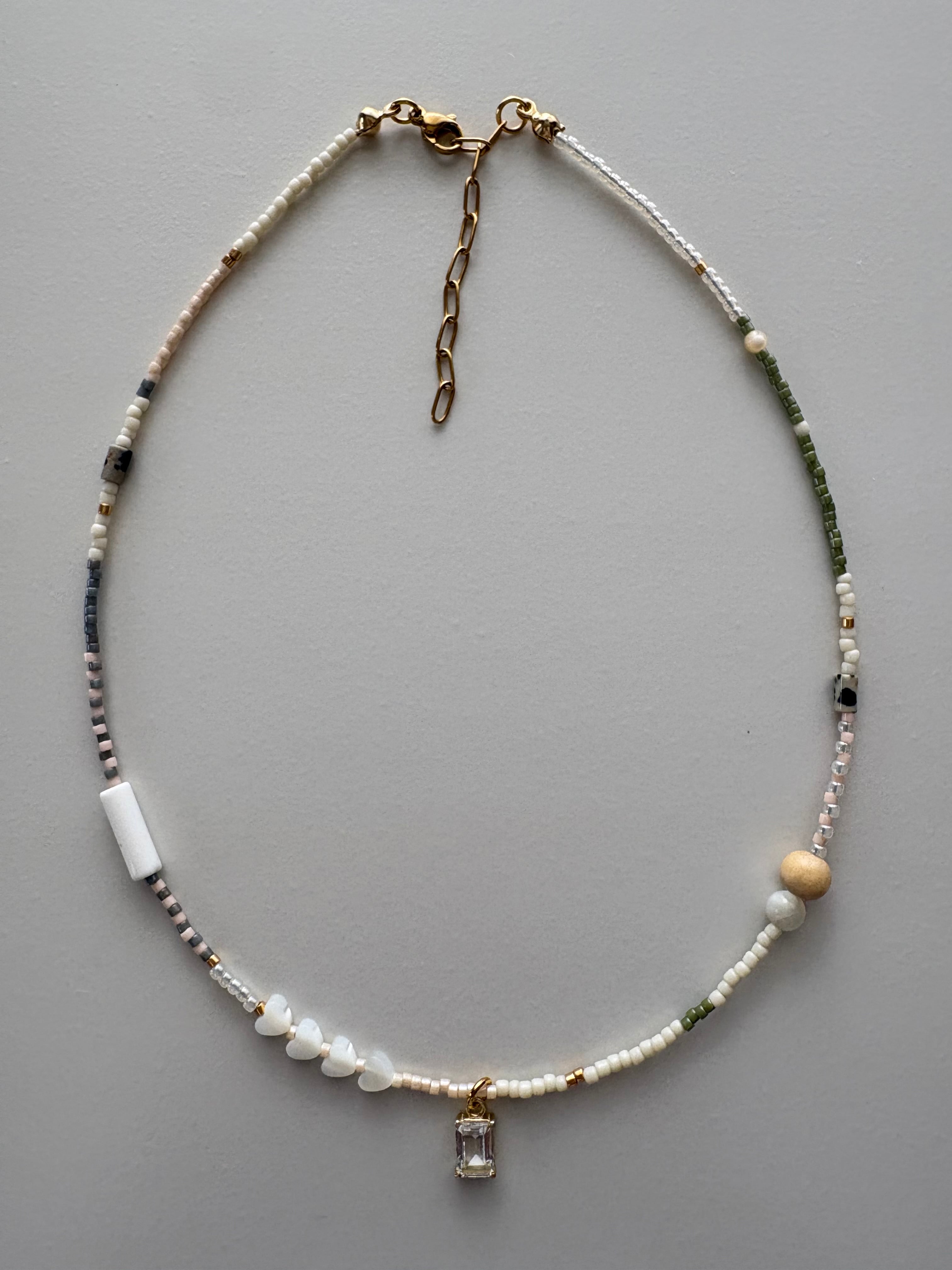全体的に淡い配色で,可愛いけどちゃんと落ち着き感と透明感がバランスよくある大人かわいいネックレスです。
